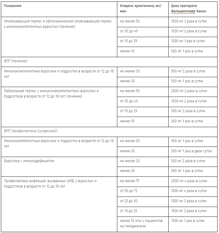 Таблица 2. Коррекция дозы препарата Валацикловир Канон для применения у взрослых и подростков в возрасте от 12 до 18 лет с нарушением функции почек.
