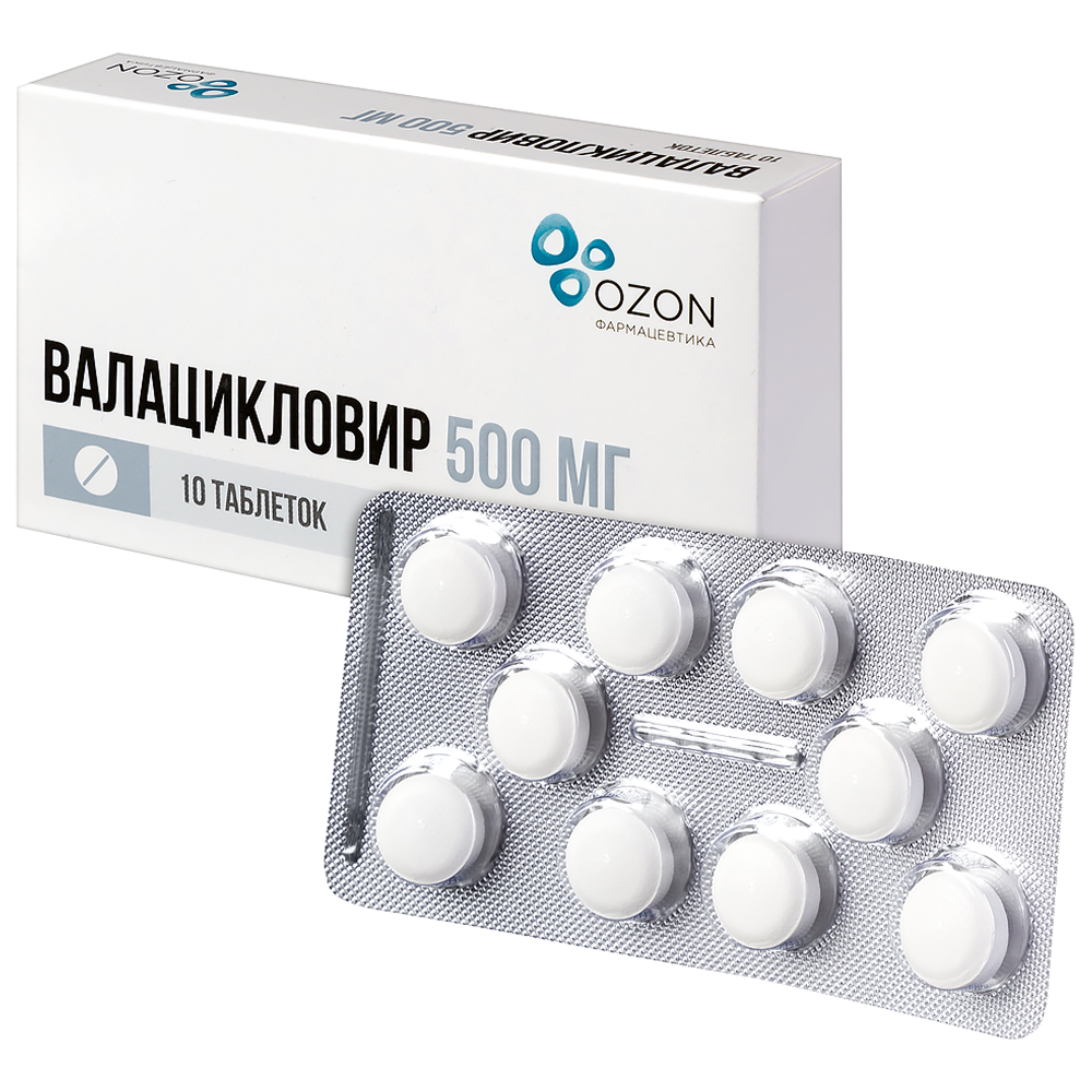 Активное вещество: валацикловира гидрохлорид 556.2 мг, что соответствует содержанию валацикловира 500 мг.