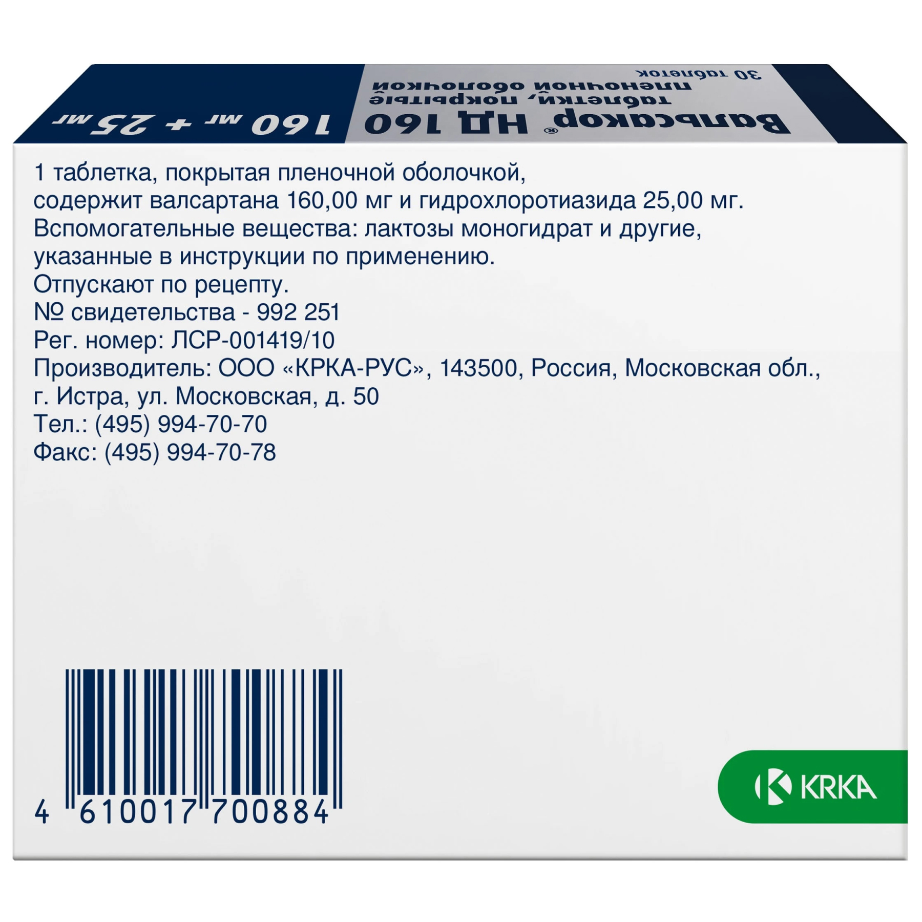 Действующие вещества: валсартан 160,00 мг, гидрохлоротиазид 25,00 мг