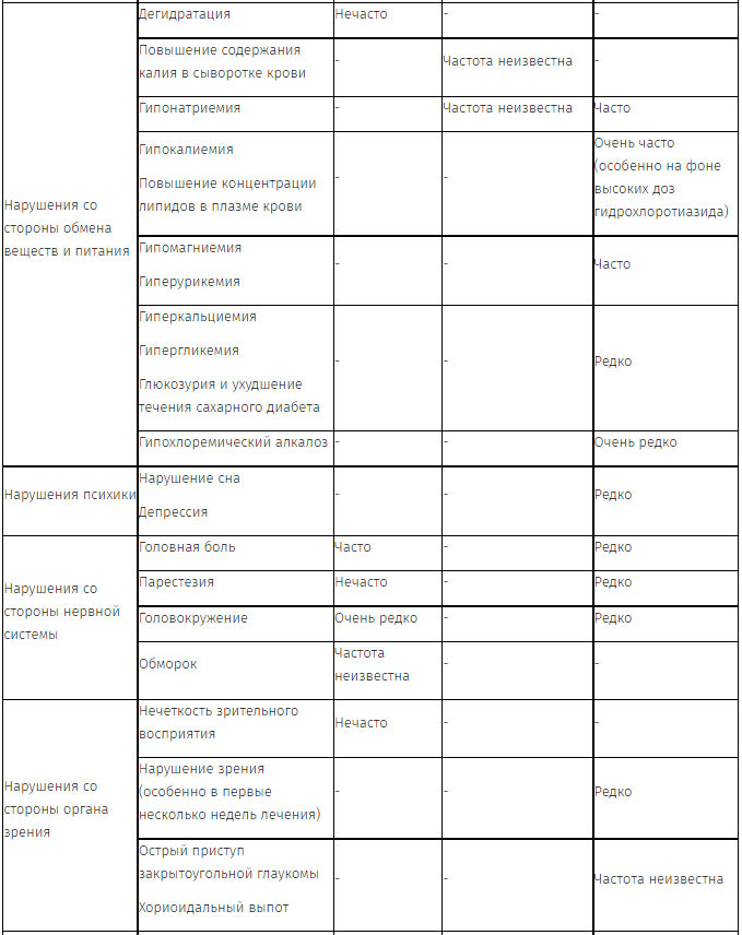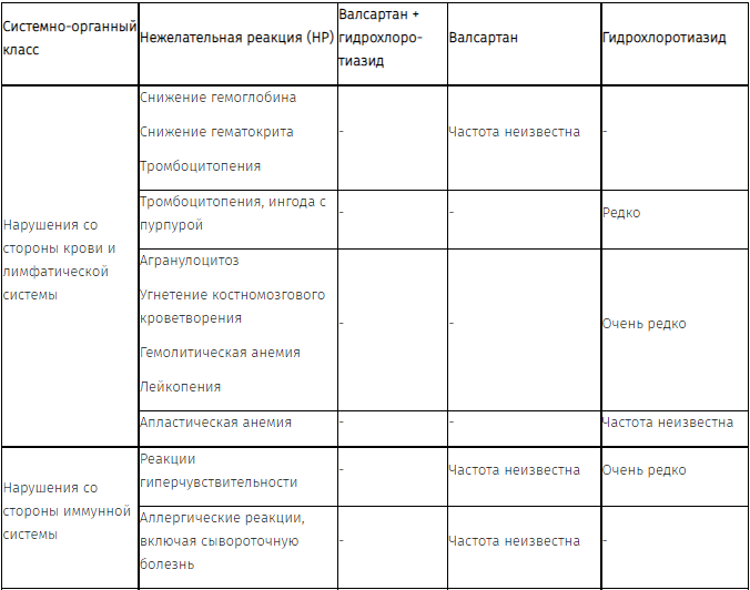 При изучении клинического применения фиксированной комбинации валсартан + гидрохлоротиазид у пациентов с артериальной гипертензией наблюдались следующие HP без очевидной связи с приемом препарата: боль в животе, боль в верхней части живота, тревога, артрит, астения, боль в спине, бронхит (в том числе острый), боль в груди, постуральное головокружение, диспепсия, одышка, сухость слизистой оболочки полости рта, носовое кровотечение, эректильная дисфункция, гастроэнтерит, головная боль, повышенное потоотделение, гипестезия, гриппоподобное состояние, бессонница, растяжение связок, мышечный спазм, мышечный гипертонус, заложенность носа, назофарингит, тошнота, боль в шее, периферические отеки, средний отит, боль в конечностях, учащенное сердцебиение, боль в гортани и глотке, пирексия, поллакиурия, гипертермия, синусит, сонливость, инфекции верхних дыхательных путей, инфекции мочевыводящих путей, вертиго, вирусные инфекции, нарушение зрения.