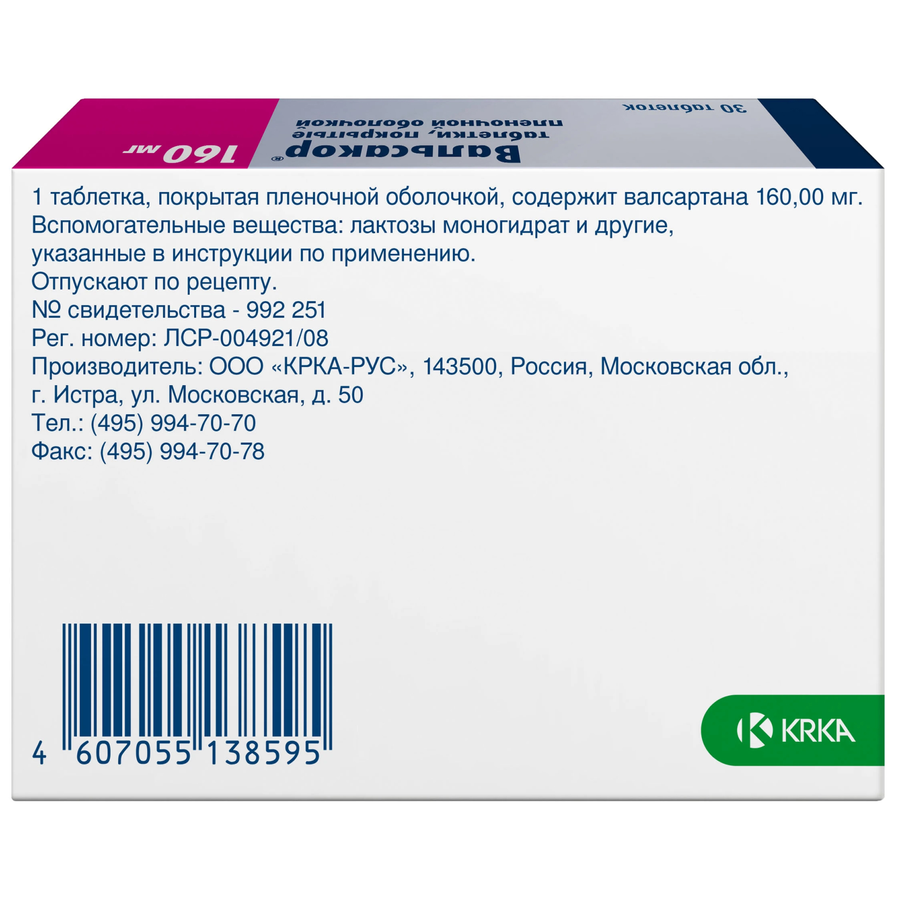 Активное вещество: валсартан 160 мг.