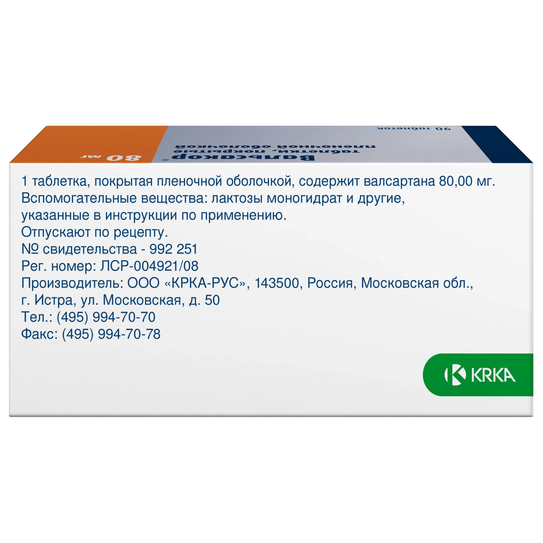 Активное вещество: валсартан 80 мг.