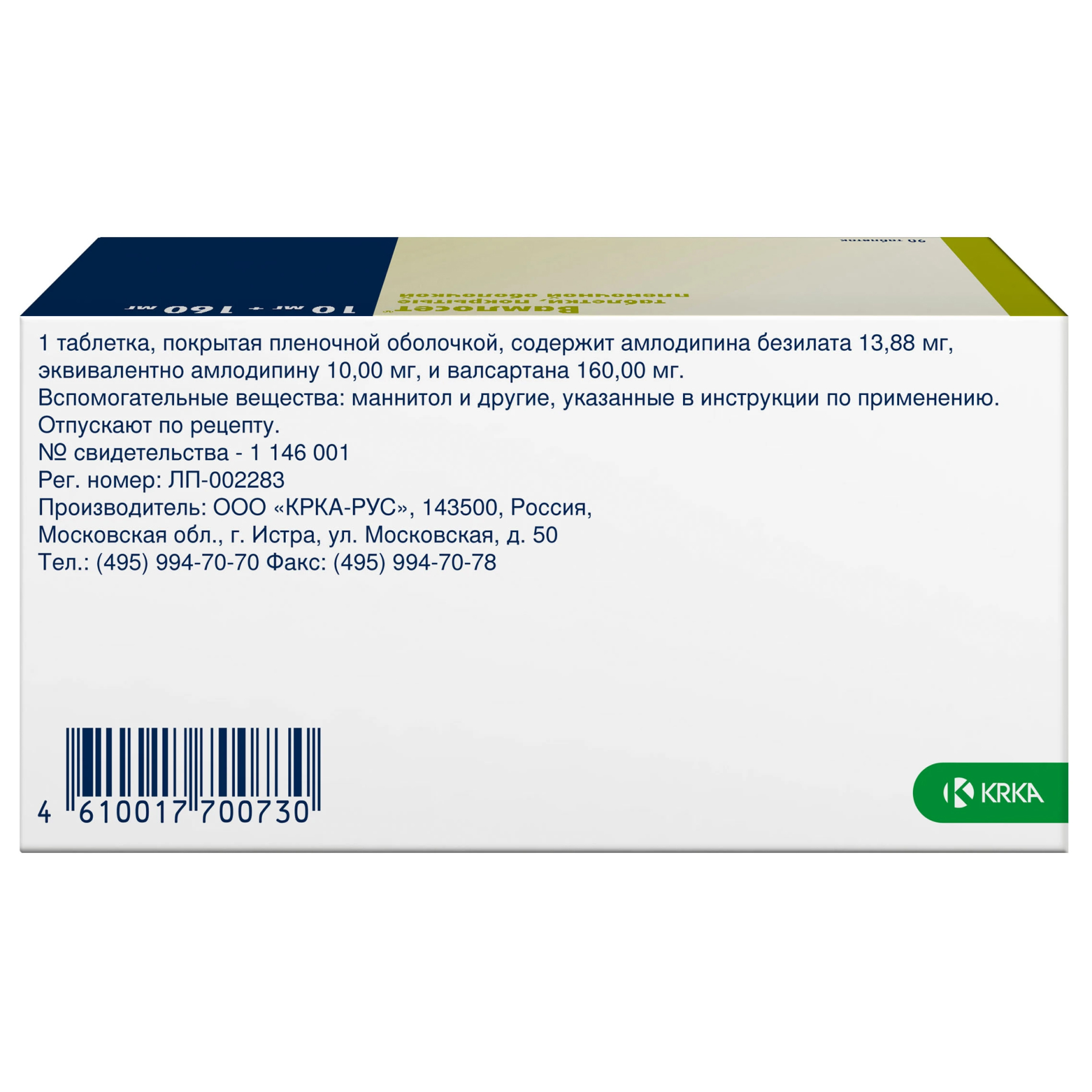 Действующие вещества: амлодипина безилат 13.88 мг, эквивалентно амлодипину 10 мг ,Валсартан А, субстанция-гранулы 251.35 мг.
