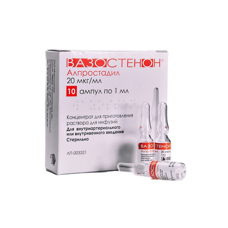 Препарат Вазостенон® должен применяться только по назначению и под наблюдением врачей, обладающих необходимой квалификацией, имеющих возможность постоянного отслеживания деятельности сердечно-сосудистой системы пациента. Препарат Вазостенон® предназначен для внутриартериального или внутривенного с введения в виде раствора. Готовить раствор необходимо непосредственно перед выполнением инфузии с соблюдением асептических условий. Раствор рекомендуется использовать сразу после приготовления, возможно временное хранение полученного раствора не более 24 часов при температуре 2-8оС. Следует избегать прямого контакта концентрата с пластиковыми поверхностями. Поэтому рекомендуется вводить концентрат в готовый раствор натрия хлорида, во избежание контакта со стенками контейнера. Внутриартериальное введение Растворить содержимое одной ампулы препарата Вазостенон® (соответствует 20 мкг алпростадила) в 50 мл изотонического 0,9 % раствора для инъекций натрия хлорида. При отсутствии других предписаний, содержимое половины ампулы препарата Вазостенон® (соответствует 10 мкг алпростадила) вводить внутриартериально в течение 60-120 мин. при использовании устройства для инфузии. При необходимости, особенно при наличии некроза, под строгим контролем переносимости препарата, дозу можно увеличить до одной ампулы (соответствует 20 мкг алпростадила), если переносимость является удовлетворительной. Эта дозировка обычно применяется для однократной ежедневной инфузии. Если внутриартериальная инфузия проводится через введенный катетер, в зависимости от переносимости и тяжести заболевания, рекомендуется доза нг/кг/мин. с введением препарата в течение 12 часов (соответствует 1/4- 11/2ампулам препарата Вазостенон®). Внутривенное введение Растворить содержимое двух ампул препарата Вазостенон® (соответствует 40 мкг алпростадила) в 50-250 мл изотонического 0,9 % раствора для инъекций натрия хлорида и вводить приготовленный раствор инфузионно внутривенно в течение 2 часов. Эта доза применяется внутривенно дважды в день. Или содержимое трех ампул препарата Вазостенон® (60 мкг алпростадила), разведенные в 50-250 мл изотонического 0,9 % раствора для инъекций натрия хлорида, вводить инфузионно внутривенно в течение 2 часов 1 раз в день. У пациентов с нарушенной функцией почек (концентрация креатинина в сыворотке крови более 1,5 мг/дл) внутривенное введение препарата Вазостенон® начинают с 20 мкг (1 ампула), вводя его дважды в день в течение 2 часов. В зависимости от общего клинического проявления дозу можно увеличить до нормальной дозы, указанной выше, в с течение 2-3 дней. Пациентам с почечной недостаточностью или пациентам, которых можно отнести к группе риска в связи с нарушением функции сердца, объем вводимой при инфузии жидкости следует ограничить до 50-100 мл в сутки, во избежание появления симптомов гипергидратации. Инфузию следует проводить с помощью инфузионных насосов. Продолжительность терапии не должна превышать 3-4 недели. Препарат Вазостенон® должен применяться только по назначению и под наблюдением врачей, обладающих необходимой квалификацией, имеющих возможность постоянного отслеживания деятельности сердечно-сосудистой системы пациента. Препарат Вазостенон® предназначен для внутриартериального или внутривенного с введения в виде раствор