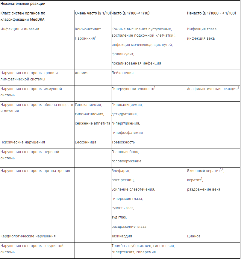 Отмечались серьезные случаи кератита и язвенного кератита, которые могут приводить к перфорации роговицы. Пациенты, у которых отмечаются признаки и симптомы, свидетельствующие о наличии кератита, в том числе острые или усугубляющиеся: воспалительные изменения глаза, слезотечение, светобоязнь, снижение четкости зрения, боли в глазу и/или покраснения глаза, должны быть немедленно направлены к офтальмологу.