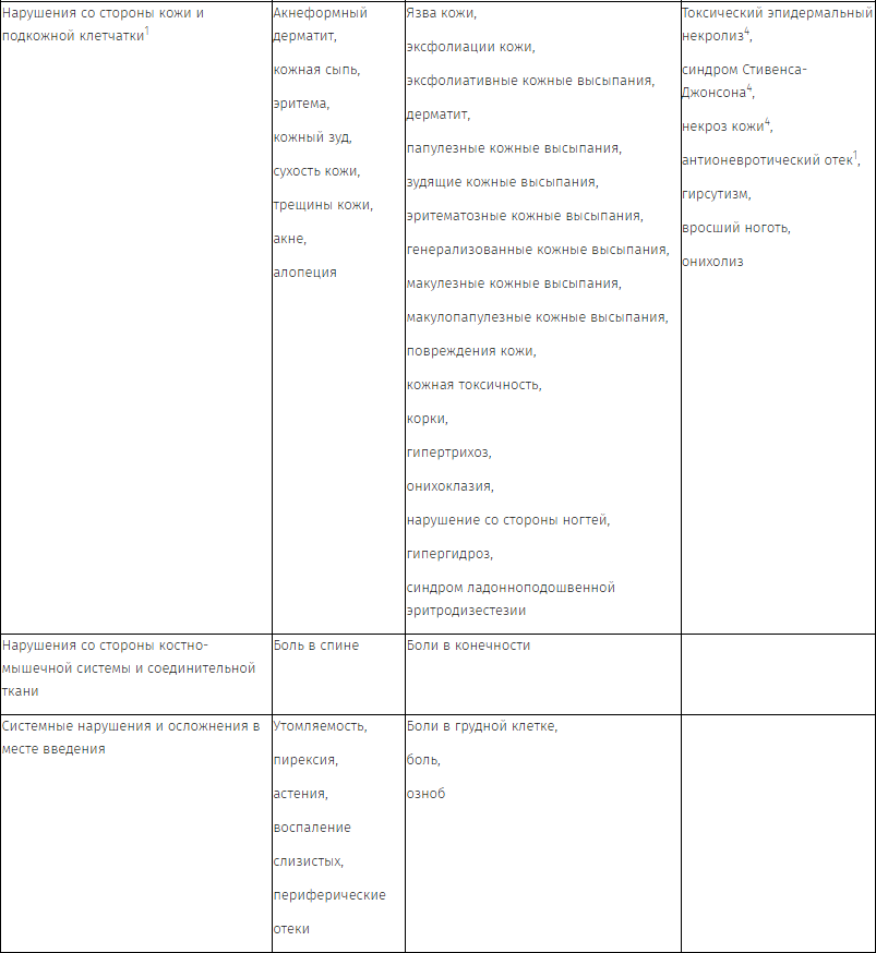 4 Язвенный кератит, некроз кожи, синдром Стивенса-Джонсона и токсический эпидермальный некролиз являются нежелательными реакциями панитумумаба, отмечавшимися в процессе его применения после регистрации. Максимальная частота этих нежелательных реакций оценивалась на основе верхней границы 95 % доверительного интервала для точечной оценки с учетом рекомендаций регуляторных органов для оценки частоты нежелательных реакций в спонтанных сообщениях. Максимальное значение частоты, рассчитанное на основе верхней границы 95 % доверительного интервала для точечной оценки, составило 3/2244 (0,13 %).