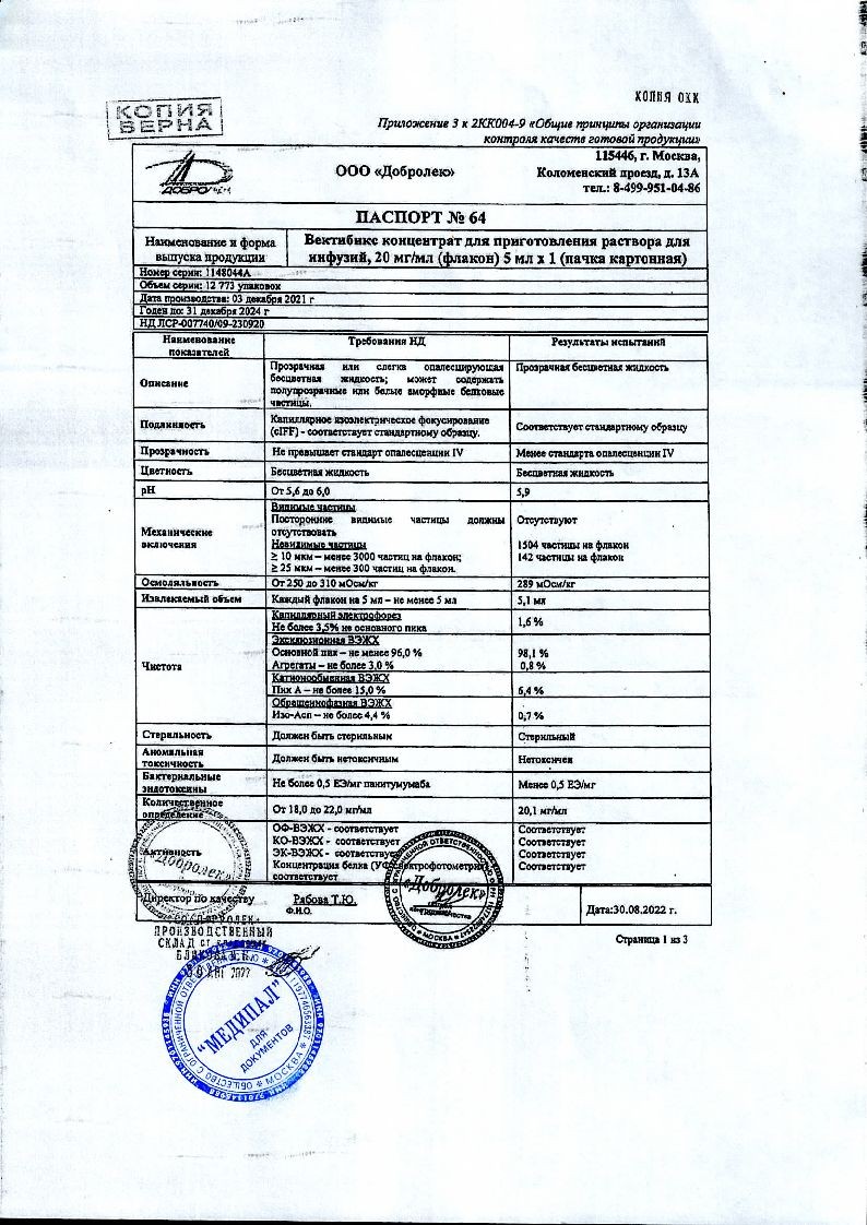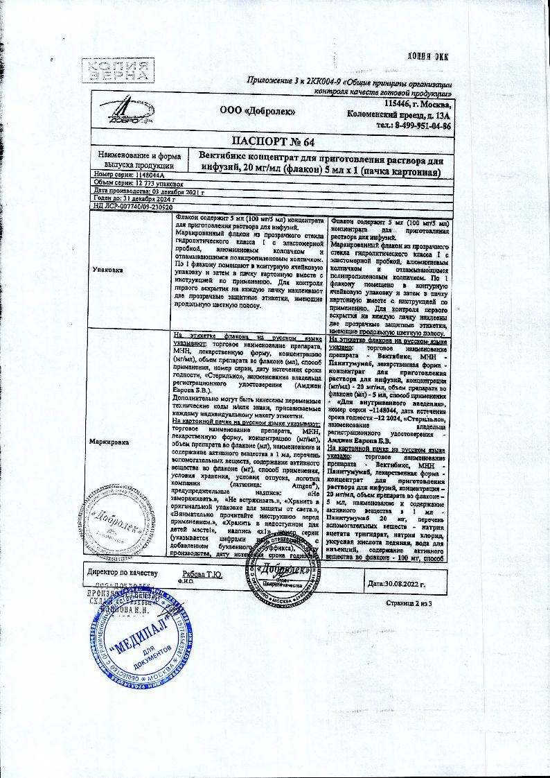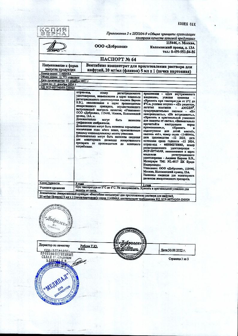Особые меры предосторожности при применении и утилизацииПрепарат Вектибикс следует вводить в периферический зонд или постоянный катетер через встроенный фильтр с размером пор 0,2 или 0,22 мкм с низкой степенью связывания белков.