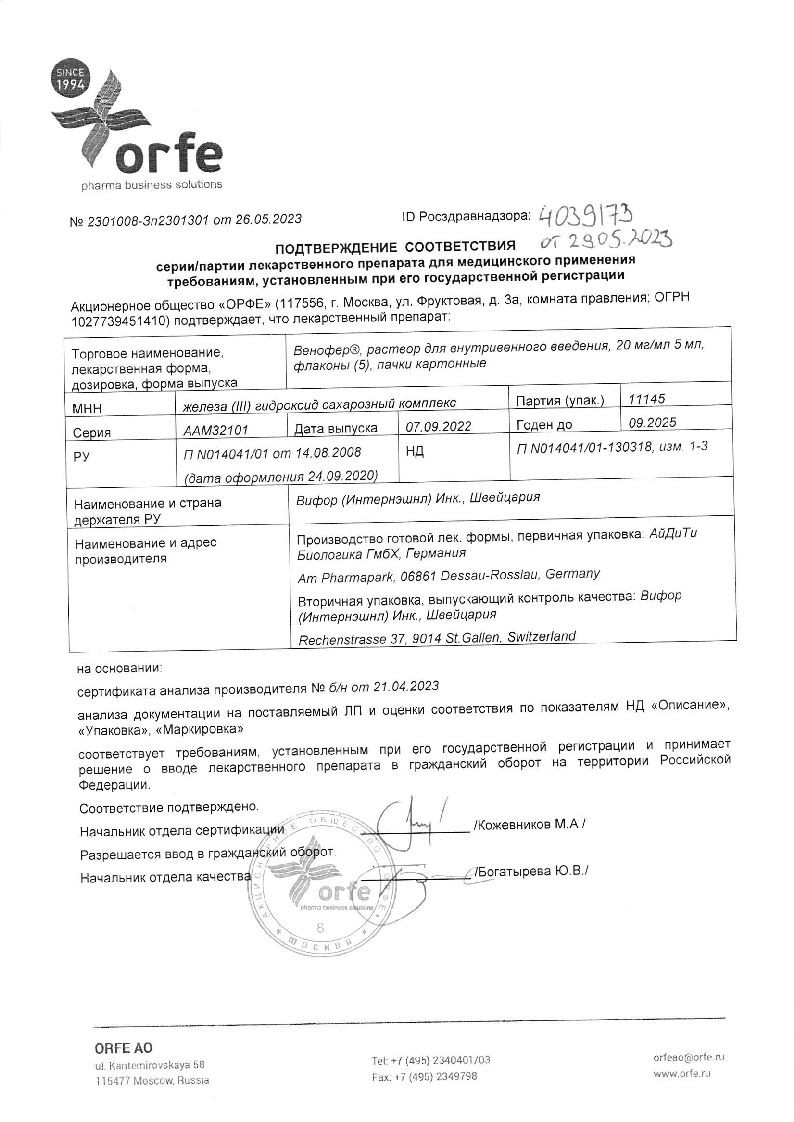 Капельное введение: Венофер® предпочтительно вводить в ходе капельной инфузии для того, чтобы уменьшить риск выраженного снижения АД и опасность попадания раствора в околовенозное пространство. Непосредственно перед инфузией Венофер® следует развести 0.9% раствором натрия хлорида в соотношении 1:20, например, 1 мл (20 мг железа) в 20 мл 0.9% раствора натрия хлорида. Полученный раствор следует вводить со следующей скоростью: 100 мг железа — не менее, чем за 15 мин; 200 мг железа — в течение 30 мин; 300 мг железа — в течение 1.5 ч; 400 мг железа — в течение 2.5 ч; 500 мг железа — в течение 3.5 ч. Введение максимально переносимой разовой дозы, составляющей 7 мг железа/кг, следует производить в течение минимум 3.5 ч, независимо от общей дозы препарата.