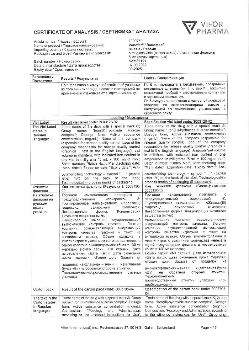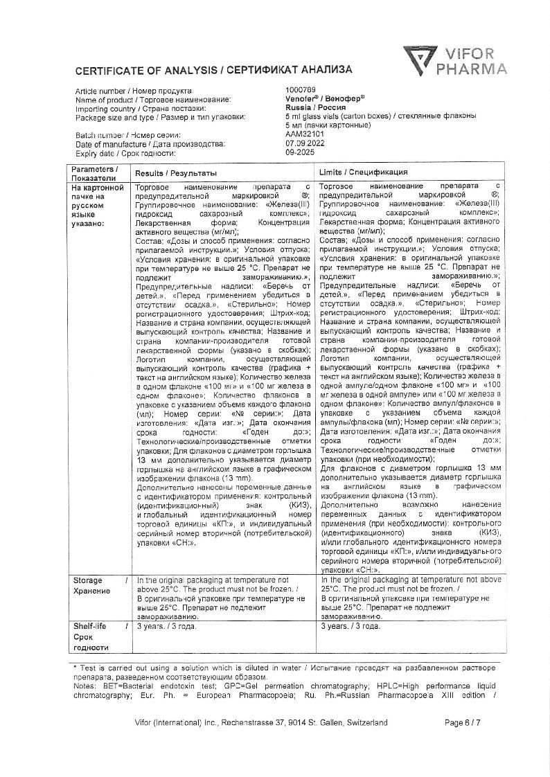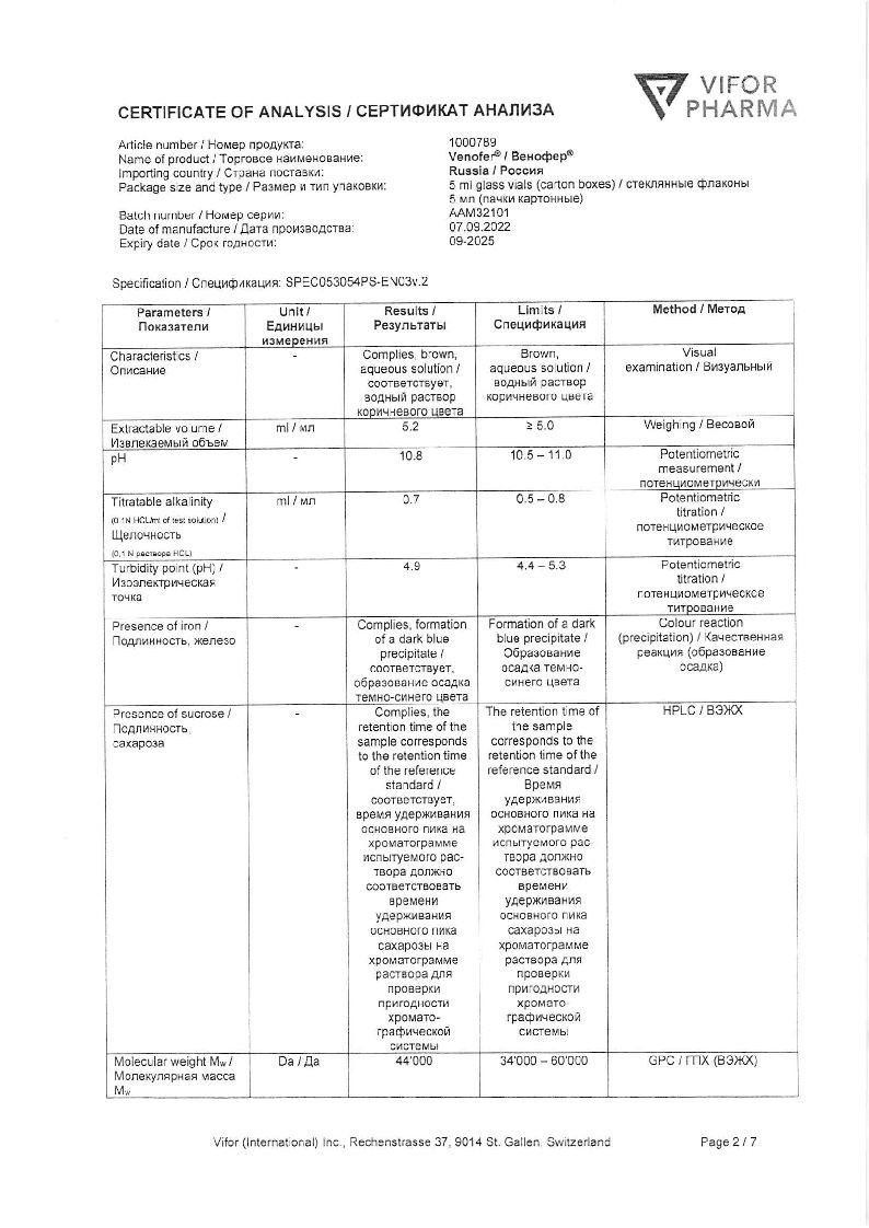 Струйное введение: препарат Венофер® также можно вводить в виде неразведенного раствора в/в медленно, со скоростью (норма) 1 мл препарата Венофер® (20 мг железа) в мин; 5 мл препарата Венофер® (100 мг железа) следует вводить минимум за 5 мин. Максимальный объем препарата не должен превышать 10 мл препарата Венофер® (200 мг железа) за 1 инъекцию.