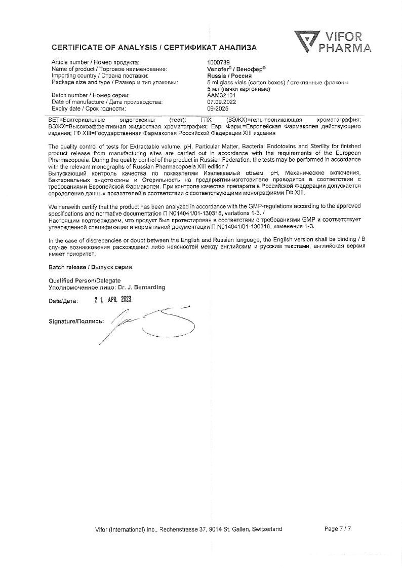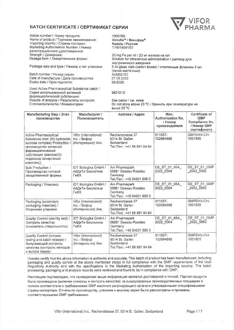 Венофер вводят только в/в (медленно капельно или струйно) или в венозный участок диализной системы. Не предназначен для в/м введения. Недопустимо одномоментное введение полной терапевтической дозы препарата.