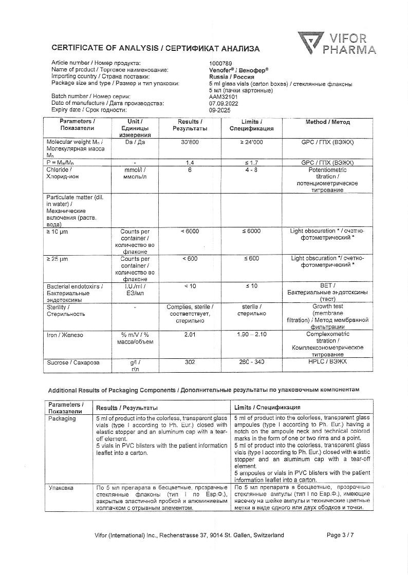Венофер вводят только в/в (медленно капельно или струйно) или в венозный участок диализной системы. Не предназначен для в/м введения. Недопустимо одномоментное введение полной терапевтической дозы препарата.