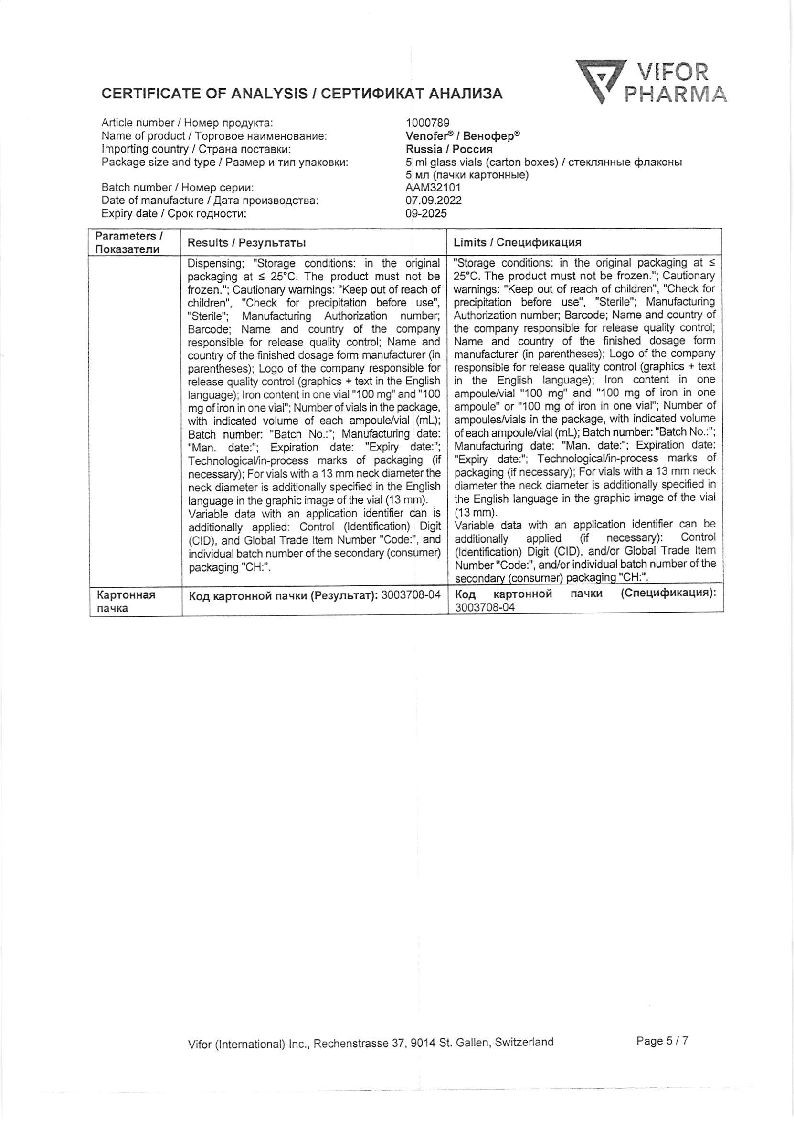 Струйное введение: препарат Венофер® также можно вводить в виде неразведенного раствора в/в медленно, со скоростью (норма) 1 мл препарата Венофер® (20 мг железа) в мин; 5 мл препарата Венофер® (100 мг железа) следует вводить минимум за 5 мин. Максимальный объем препарата не должен превышать 10 мл препарата Венофер® (200 мг железа) за 1 инъекцию.