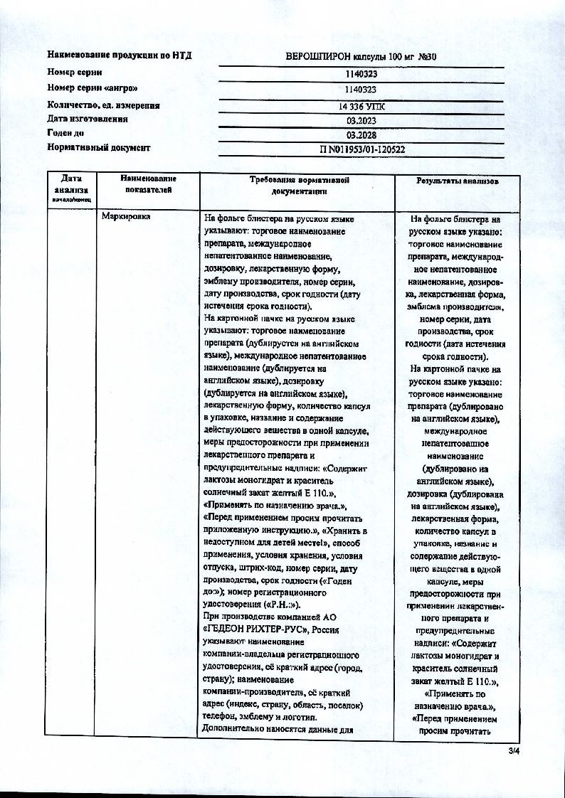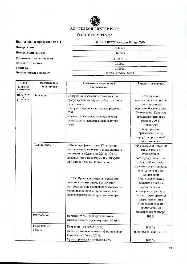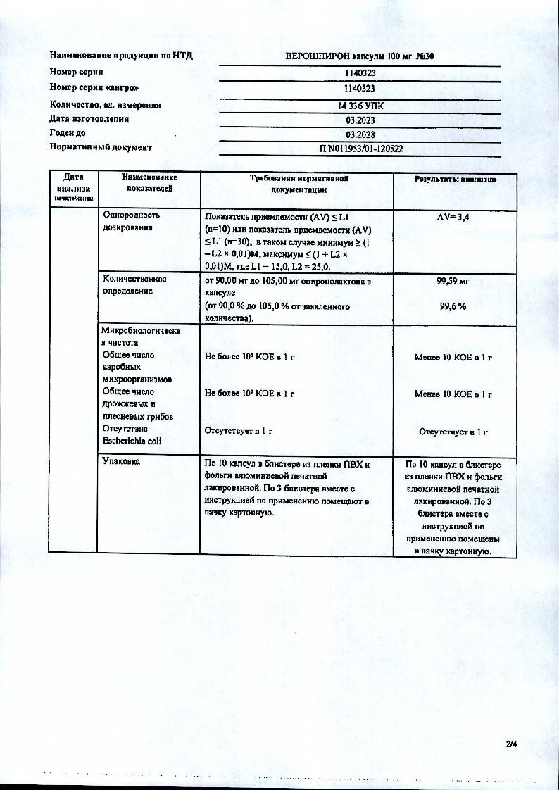 Начальная доза составляет 100 мг и может изменяться в интервале от 25* до 200 мг/сут, препарат можно принимать за 1-2 приема. При приеме более высоких доз препарат Верошпирон может применяться совместно с диуретиком, действующим в проксимальном отделе почечного канальца. В этом случае дозу спиронолактона следует скорректировать.