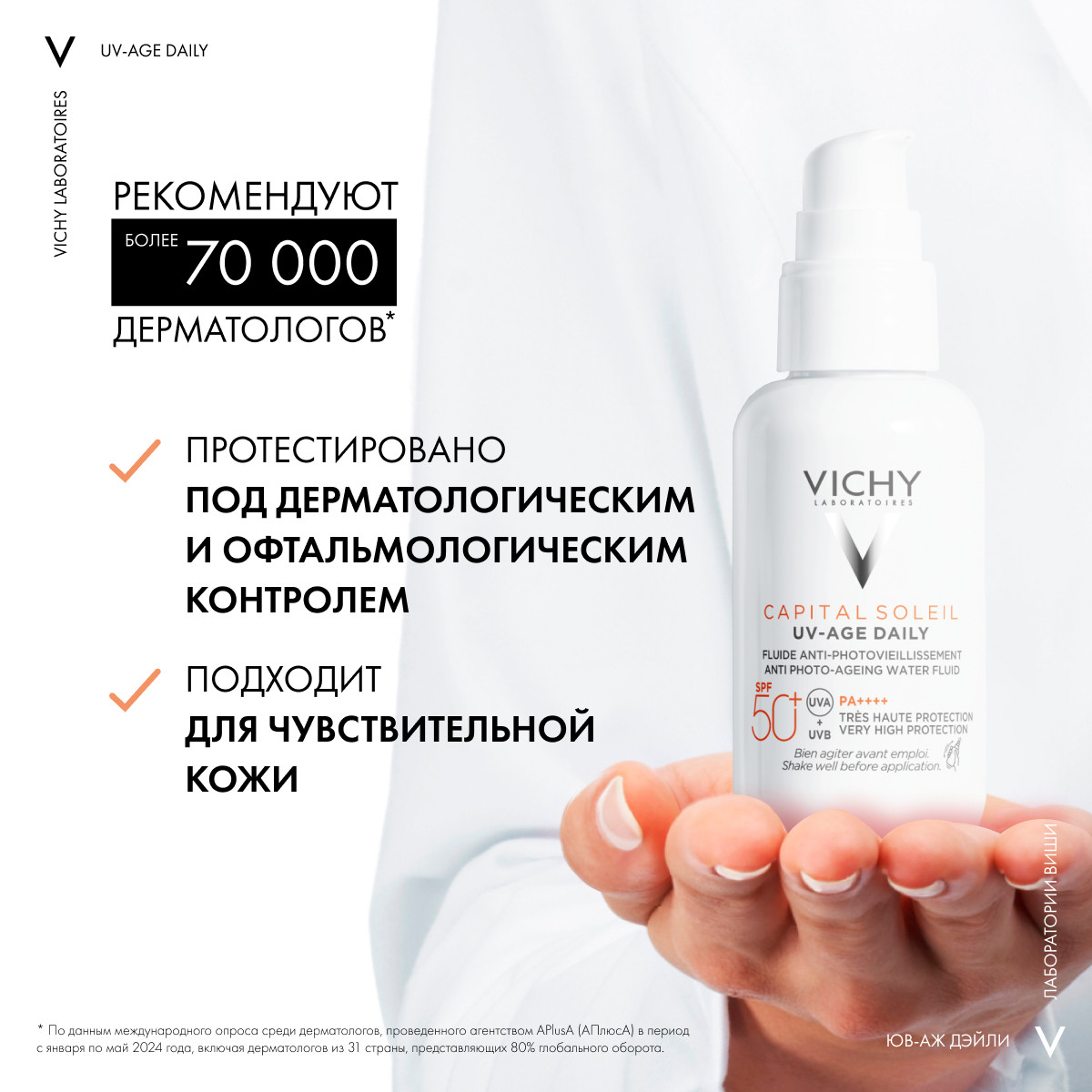 Невесомый солнцезащитный флюид для лица против признаков фотостарения «UV-age daily» SPF50+ обеспечивает очень высокую степень UVA и UVB защиты. Защищает от признаков фотостарения кожи – пигментации, преждевременных морщин и снижения эластичности кожи, вызванных воздействием UV-лучей. Обеспечивает антиоксидантную защиту от последствий негативного воздействия окружающей среды и инфракрасного излучения.