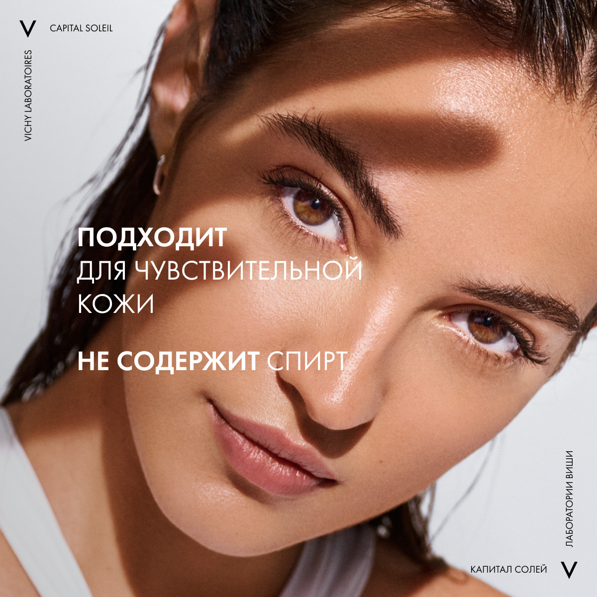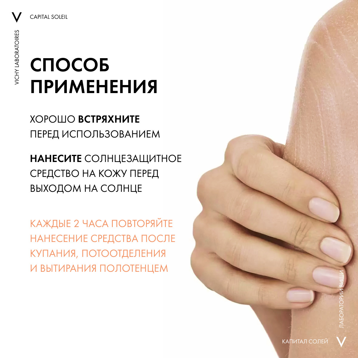 Vichy Ideal Soleil Brume hydratante invisible SPF 50 – легкий спрей без спирта, который подходит даже для очень чувствительной кожи. Он окутывает тело легкой освежающей вуалью, моментально устраняет дискомфорт от сухости, стянутости и раздражения. Запатентованные водо- и фотоустойчивые фильтры Mexoryl XL и Parsol надолго обеспечивают высокую степень защиты от UVА- и UVB-лучей. Виши Капитал Идеал Солей Спрей-вуаль увлажняющий SPF50 разглаживает и смягчает кожу, восстанавливает ее здоровое сияние, замедляет возрастное старение. Быстро впитывается, не оставляет белого налета, липкой пленки, жирного блеска. Отвечает европейским требованиям к солнцезащитной косметике.