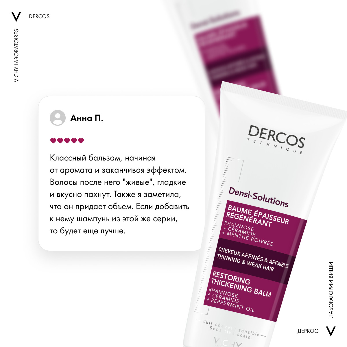 Обновленная линия Dercos Densi-Solutions создана специально для слабых, редеющих волос. Уплотняющий Бальзам Денси-Солюшнс смягчает волосы, насыщая их питательными веществами, возвращает им прочность, обеспечивает легкое расчесывание, делает пряди блестящими, не утяжеляя их. Продукт наполняет волосяной стержень жизненно важной энергией, снимает статическое напряжение. Специалисты компании Виши рекомендуют использовать Уплотняющий бальзам в паре с уплотняющим шампунем Densi-Solutions, что обеспечит волосам упругость, густоту и внутреннюю силу уже с первого применения.