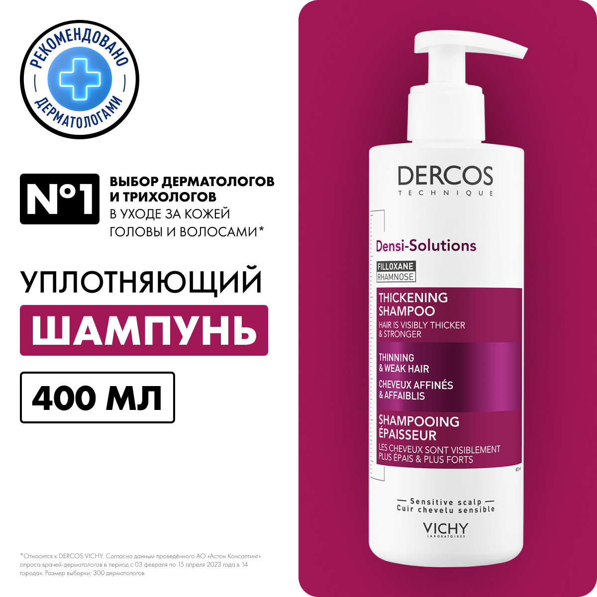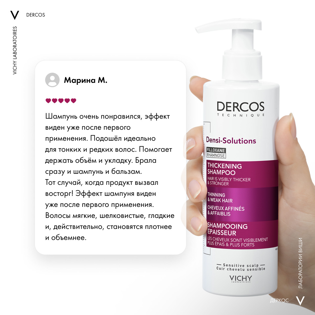 Обновленная линия Dercos Densi-Solutions создана специально для слабых, утративших объем волос. Шампунь Виши уплотняющий бережно очищает, возвращает волосам плотность, укрепляет волосяной стержень изнутри, придает прядям густоту и блеск. Уже после первого применения волосы на 40% более объемные, приобретают естественную красоту и силу.