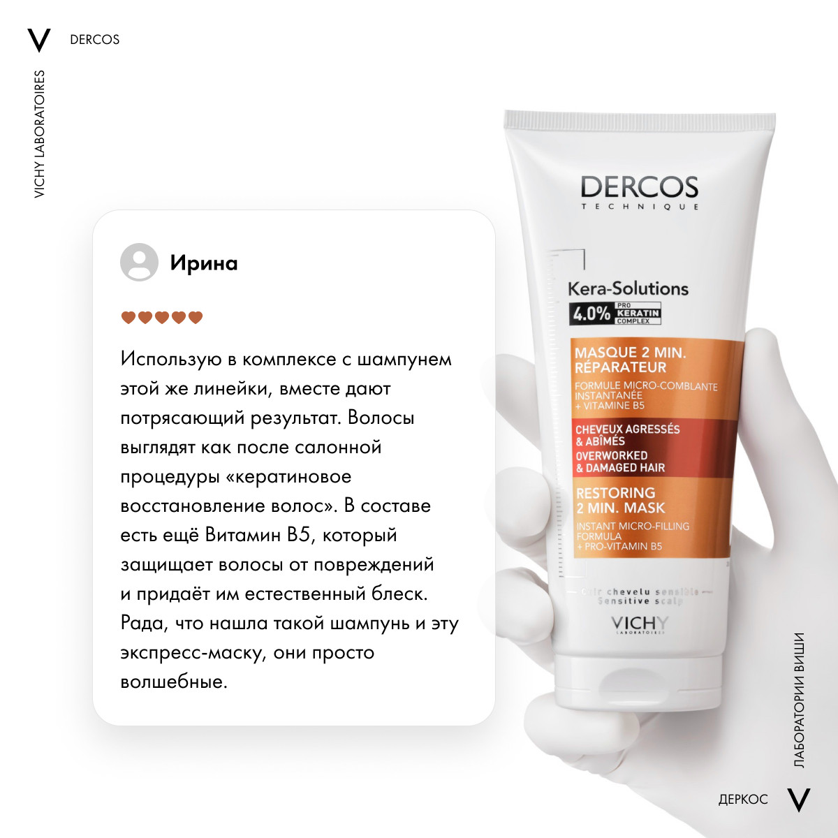 придает локонам гладкость шелка по всей длине. Подарите волосам живой блеск, силу и качественный уход вместе с реконструирующей маской от Виши Деркос Кера-Солюшнз.