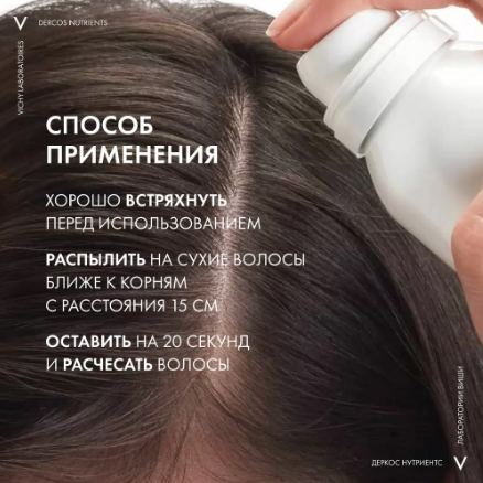 Встряхните флакон перед использованием. Распылите средство на сухие волосы ближе к корням с расстояния 15 см. Оставьте на 20 секунд, после чего расчешите волосы.