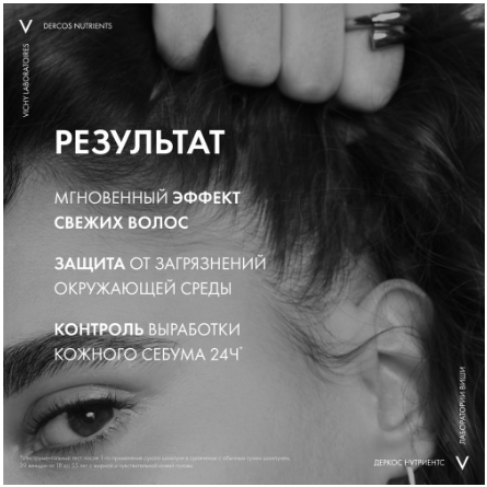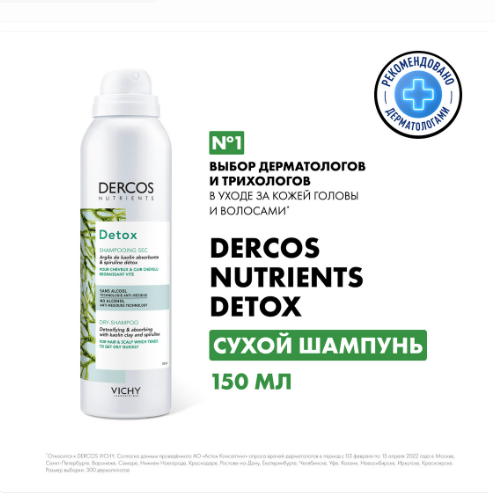 Шампунь Dercos Nutrients Detox – первый сухой шампунь с мгновенным эффектом свежести волос созданный на базе растительных ингредиентов. Разработан специально для волос и кожи головы, которые нуждаются в частом мытье. Формула с каолином и экстрактом водоросли спирулина, известной детоксифицирующими свойствами, регулирует выработку кожного себума в течение 24 часов. Обеспечивает продолжительную свежесть волос и защиту от загрязнений окружающей среды.