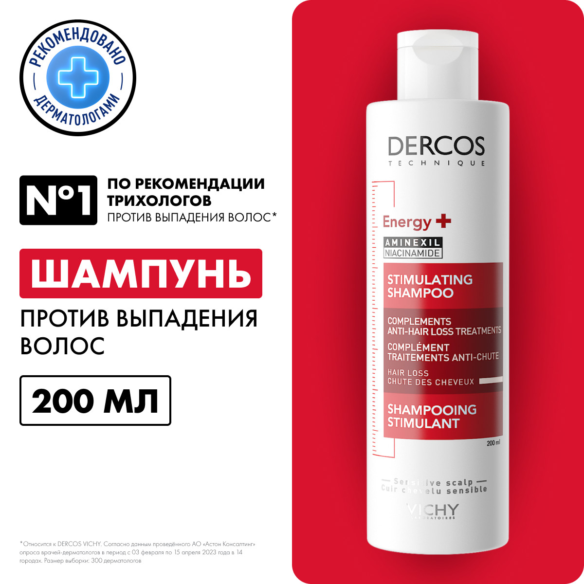 Шампунь с перламутровой гелевой текстурой Vichy Dercos Shampooing énergisant anti-chute содержит запатентованный комплекс Aminexil, который активизирует микроциркуляцию кожи головы, замедляет уплотнение коллагеновых оболочек волосяных фолликулов, восстанавливает здоровую структуру стержней волос. Результат – сокращение выпадения и ускорение роста волос, устранение их ломкости и сечения. Виши Деркос Шампунь Тонизирующий против выпадения волос сохраняет естественный уровень рН и гидролипидную защиту кожи головы и волос, поэтому подходит для частого использования. 78% из 154 участников трехнедельного дерматологического тестирования отметили, что выпадение существенно уменьшилось, а 76% – волосы стали сильнее от корней до кончиков. Применение этого шампуня повышает эффективность ампул Виши Деркос Аминексил ПРО против выпадения волос для мужчин и для женщин.