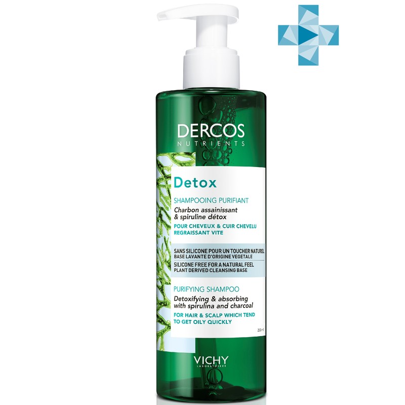 Dercos Nutrients Shampoo Detox - инновационное средство компании Виши, созданное для решения проблемы жирности волос в краткие сроки. Продукт обладает свойствами детокса, благодаря входящему в состав экстракту водоросли спирулины. Деркос Шампунь глубоко очищающий надолго дарит волосам свежесть и легкость, эффективно, но в то же время бережно очищает их и детоксифицирует, поддерживает баланс кожи головы. Локоны приобретают объем и ухоженный вид. По результатам исследования, 55% людей отметили более качественное очищение волос и кожи головы.