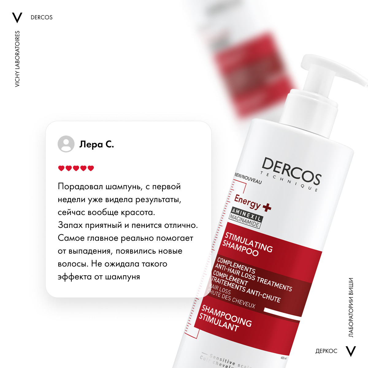 Шампунь с перламутровой гелевой текстурой Vichy Dercos Shampooing énergisant anti-chute содержит запатентованный комплекс Aminexil, который активизирует микроциркуляцию кожи головы, замедляет уплотнение коллагеновых оболочек волосяных фолликулов, восстанавливает здоровую структуру стержней волос. Результат – сокращение выпадения и ускорение роста волос, устранение их ломкости и сечения. Виши Деркос Шампунь Тонизирующий против выпадения волос сохраняет естественный уровень рН и гидролипидную защиту кожи головы и волос, поэтому подходит для частого использования. 78% из 154 участников трехнедельного дерматологического тестирования отметили, что выпадение существенно уменьшилось, а 76% – волосы стали сильнее от корней до кончиков. Применение этого шампуня повышает эффективность ампул Виши Деркос Аминексил ПРО против выпадения волос для мужчин и для женщин.
