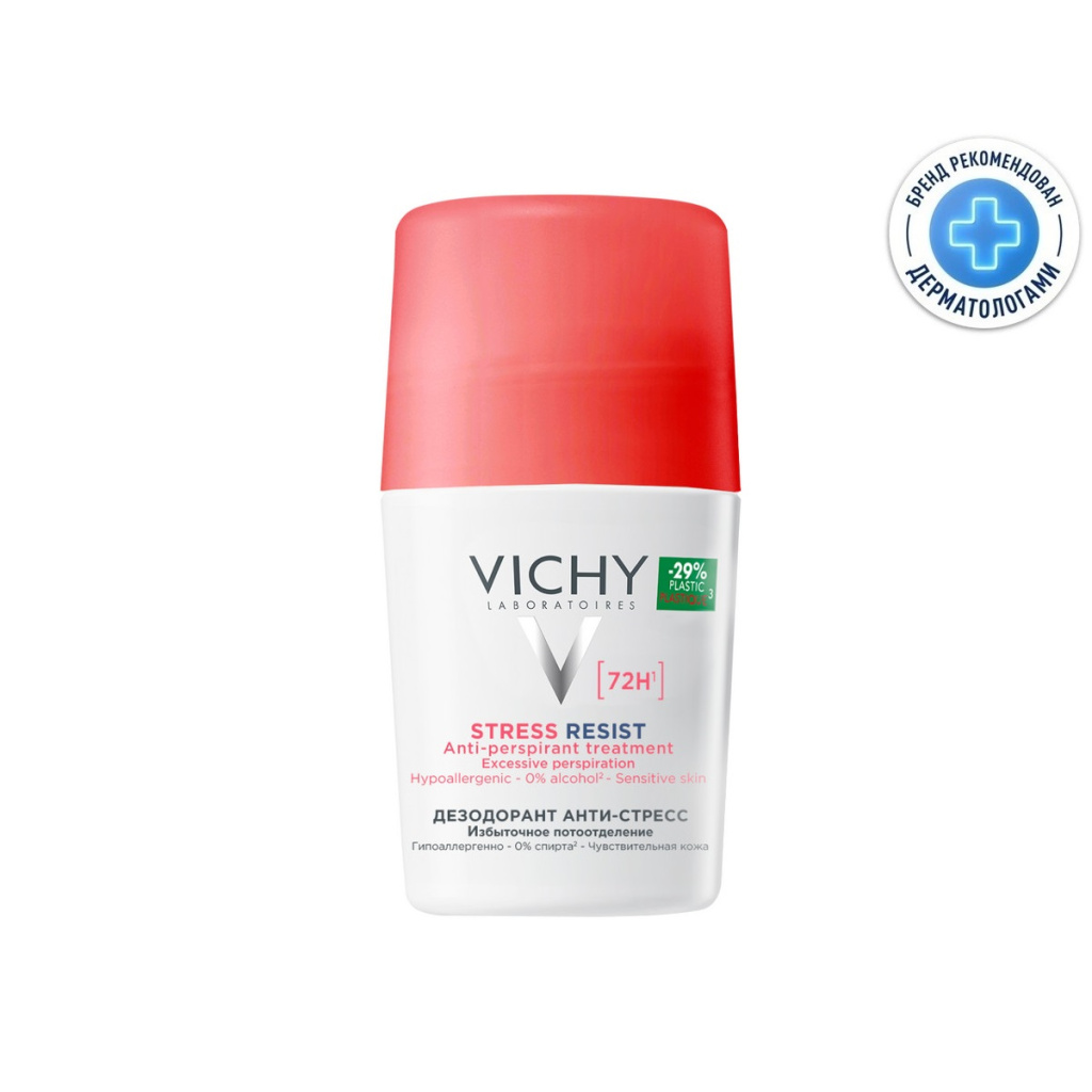 Суперэффективный дезодорант-антиперспирант Vichy Deodorant Stress Resist 72h подарит вам 72 часа уверенности и комфорта. Средство блокирует выработку пота в подмышечных впадинах даже в состоянии сильного стресса – на одежде не появятся влажные пятна. На сухой коже не размножаются бактерии, из-за которых появляется специфический запах. Шариковый дезодорант Виши Анти-стресс 72 часа защиты от избыточного потоотделения не содержит спирта и парабенов, поэтому подходит для чувствительной кожи. Тонкий аромат не конкурирует с парфюмом.