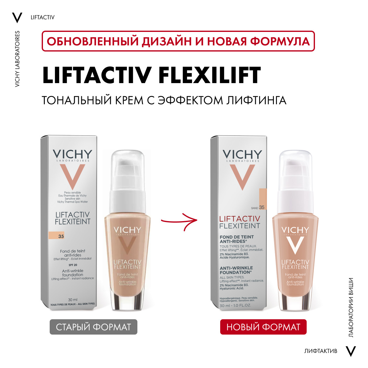 Vichy Liftactiv Flexilift 35 поддерживает ровный и сияющий цвет лица в течение дня. Обогащенная Коллагилом® формула активно борется с морщинами и заметно уменьшает их за месяц применения. В течение 8 часов тональный крем не только обеспечивает стойкий макияж, но и подтягивает контуры лица, зрительно делает морщины менее выраженными . Легкая текстура крема хорошо распределяется по коже, не накапливается в морщинах, не оставляет ощущения «маски».