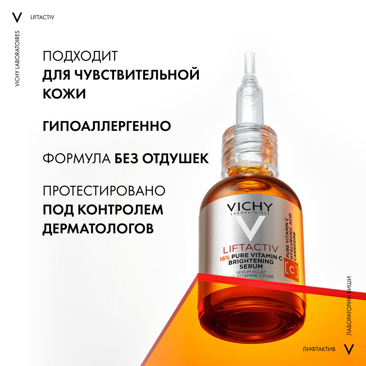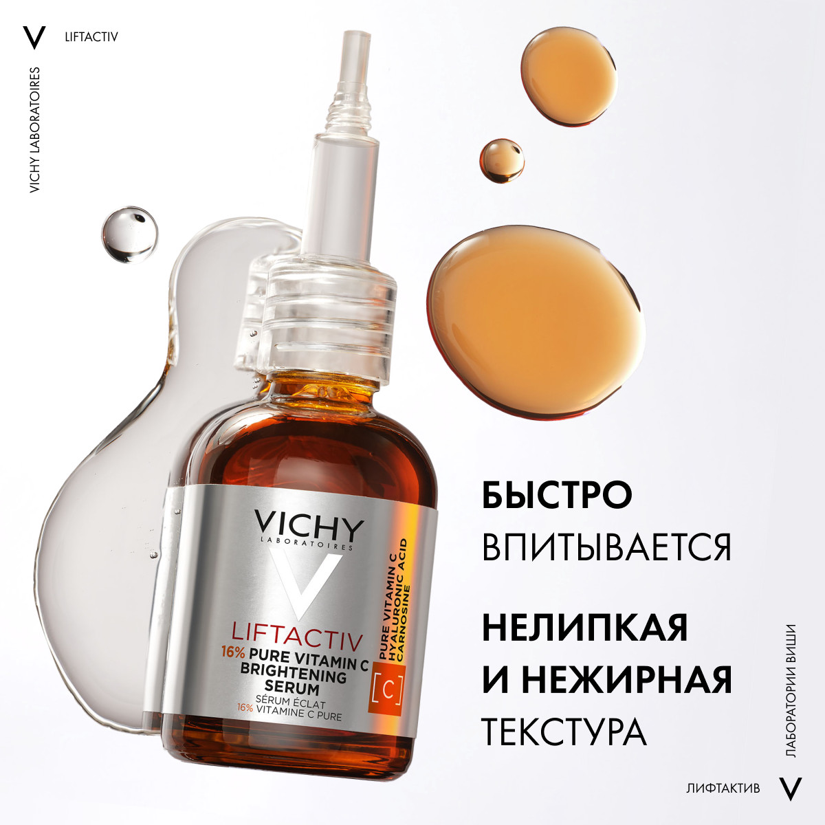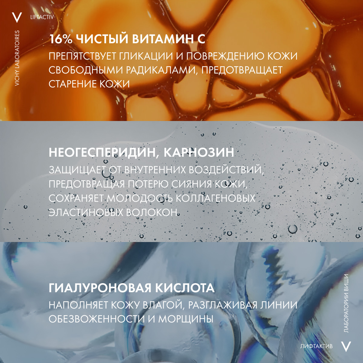 Формула Vichy Liftactiv Supreme Vitamin C serum обогащена вулканической водой и эффективными антиоксидантами: чистый витамин С в концентрации 15%, пикногенол и витамин Е. Усиливает антиоксидантную защиту кожи, придает ей сияние за 10 дней и разглаживает морщины. Текстура невесомая, быстро впитывается без липкости и жирности. Высокотехнологичная упаковка из перерабатываемых материалов, аппликатор точно дозирует средство и сохраняет его гигиеничным, без контакта с внешней средой.