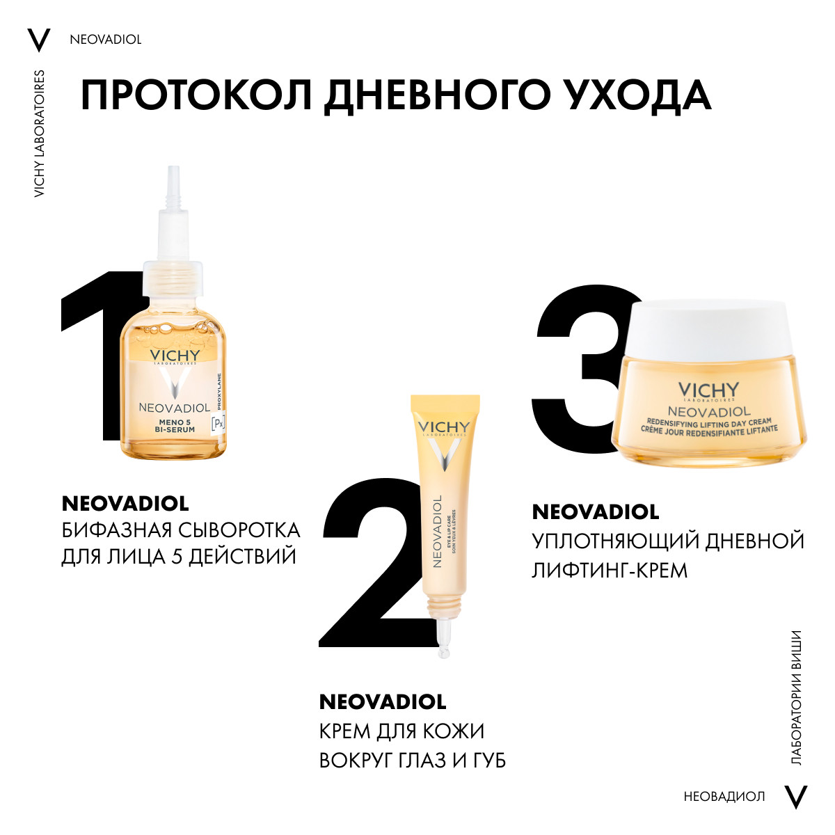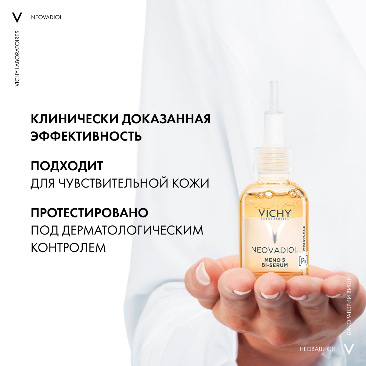 Vichy Neovadiol Meno 5 Bi-serum действует сразу в пяти направлениях: повышает упругость кожи, выравнивает тон кожи, разглаживает морщины, ремоделирует контуры лица, питает кожу. Предназначена для ухода за кожей в период менопаузы, для всех типов кожи. Протестировано под контролем дерматологов.