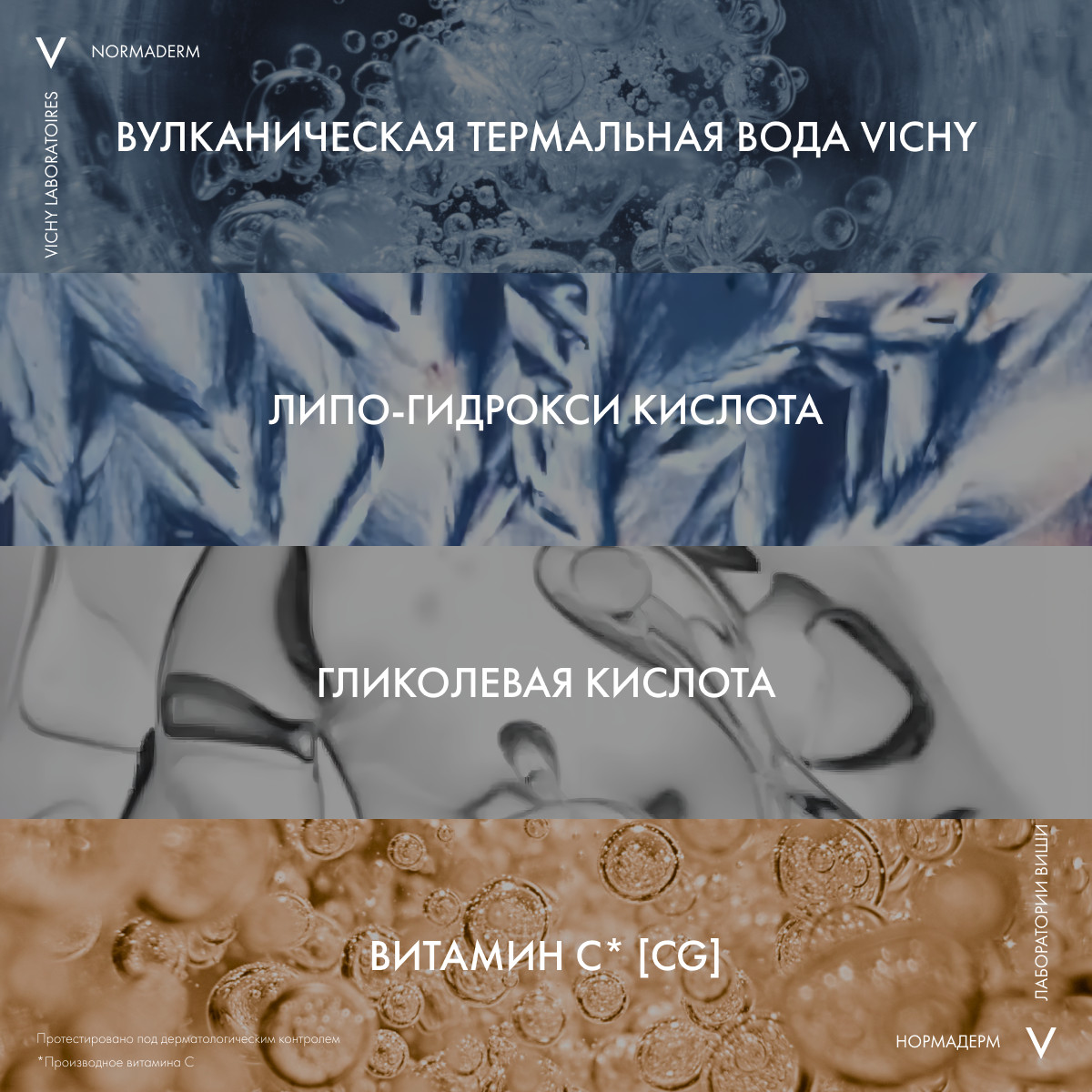 Vichy Normaderm Anti-age Soin resurfaçant – полноценный уход за проблемной кожей с первыми признаками старения. Средство действует в двух направлениях: устраняет несовершенства проблемной кожи и омолаживает ее. Два активных пилинг-ингредиента (гликолевая и липо-гидрокси к-ты) борются с черными точками, прыщами, закупоренными порами, воспалениями и жирным блеском. Витамин С тонизирует, стимулирует выработку коллагена, подтягивает и обновляет роговой слой. Кожа становится заметно моложе и эластичнее, ее тон разглаживается, исчезает жирный блеск. Мягкая формула без масел подходит для чувствительной кожи, не оставляет жирной и липкой пленки. Крем Виши Нормадерм для проблемной кожи с первыми признаками старения прошел дерматологические испытания.