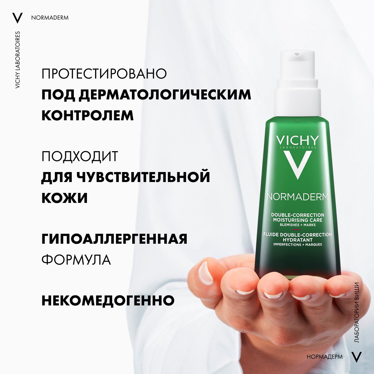 Если вы столкнулись с проблемами жирной кожи, то Vichy Normaderm Phytosolution Double-Correction Daily Care создан именно для вас. Специальный уход обеспечит не только коррекцию несовершенств, но и устранение их причины. Лечебный эффект достигается благодаря наличию в составе салициловой кислоты и пробиотика Bifidus. Уникальная формула средства помогает сузить поры, очистить их от комедонов, выровнять тон лица и рельеф кожи, успокоить воспаленные очаги. Корректирующий Уход Виши Нормадерм Фитосолюшн прекрасно увлажняет кожу, укрепляет ее барьерную функцию, предупреждает появление несовершенств. По результатам теста с участием 50 женщин, 100% респондентов уже после первого применения заметили сужение пор. В течение 8 недель регулярного применения 62% женщин отметили уменьшение количества следов постакне, 42% - воспалительных элементов, 37% - количество черных точек.
