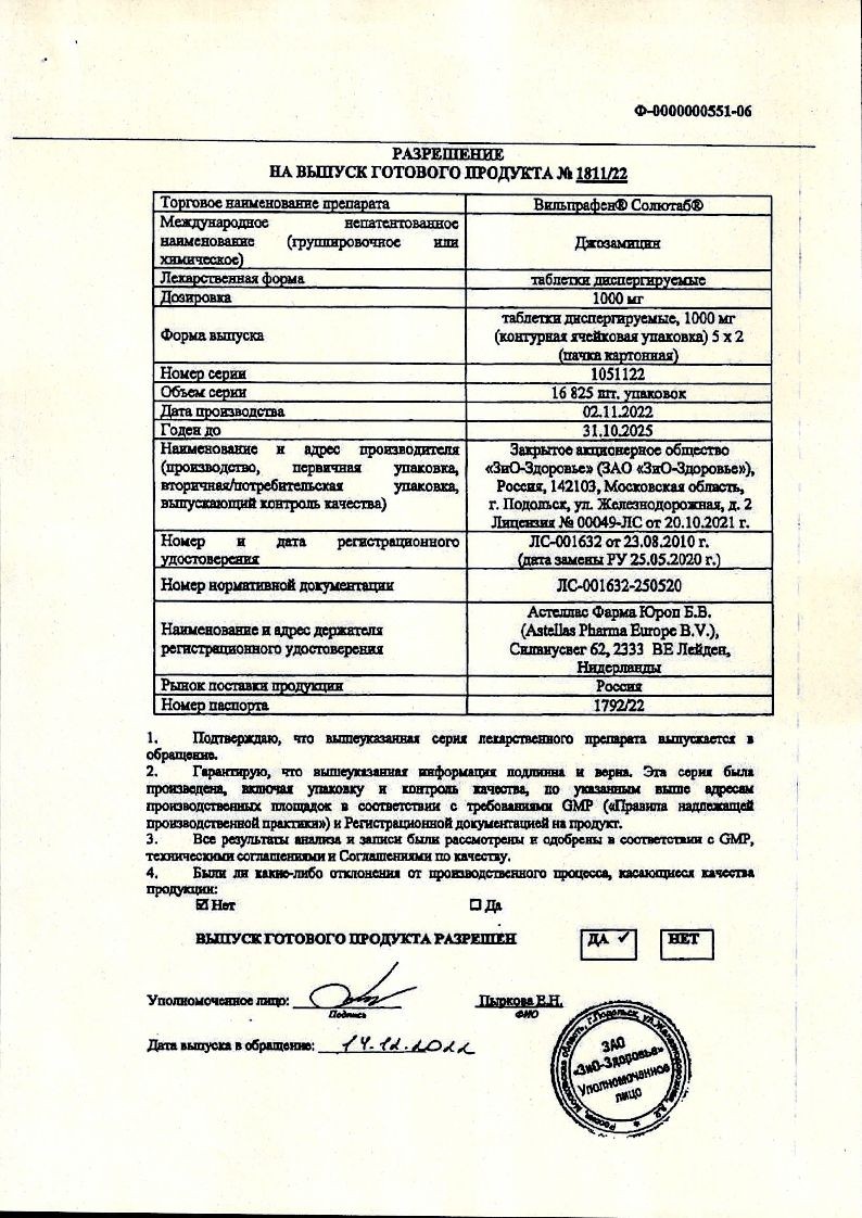После приема внутрь джозамицин быстро абсорбируется из ЖКТ. Сmax достигается через 1-2 ч после приема. Через 45 мин после приема дозы 1 г средняя концентрация джозамицина в плазме составляет 2.41 мг/л.