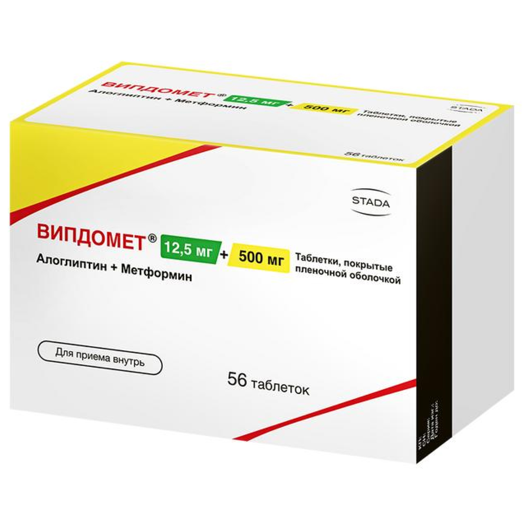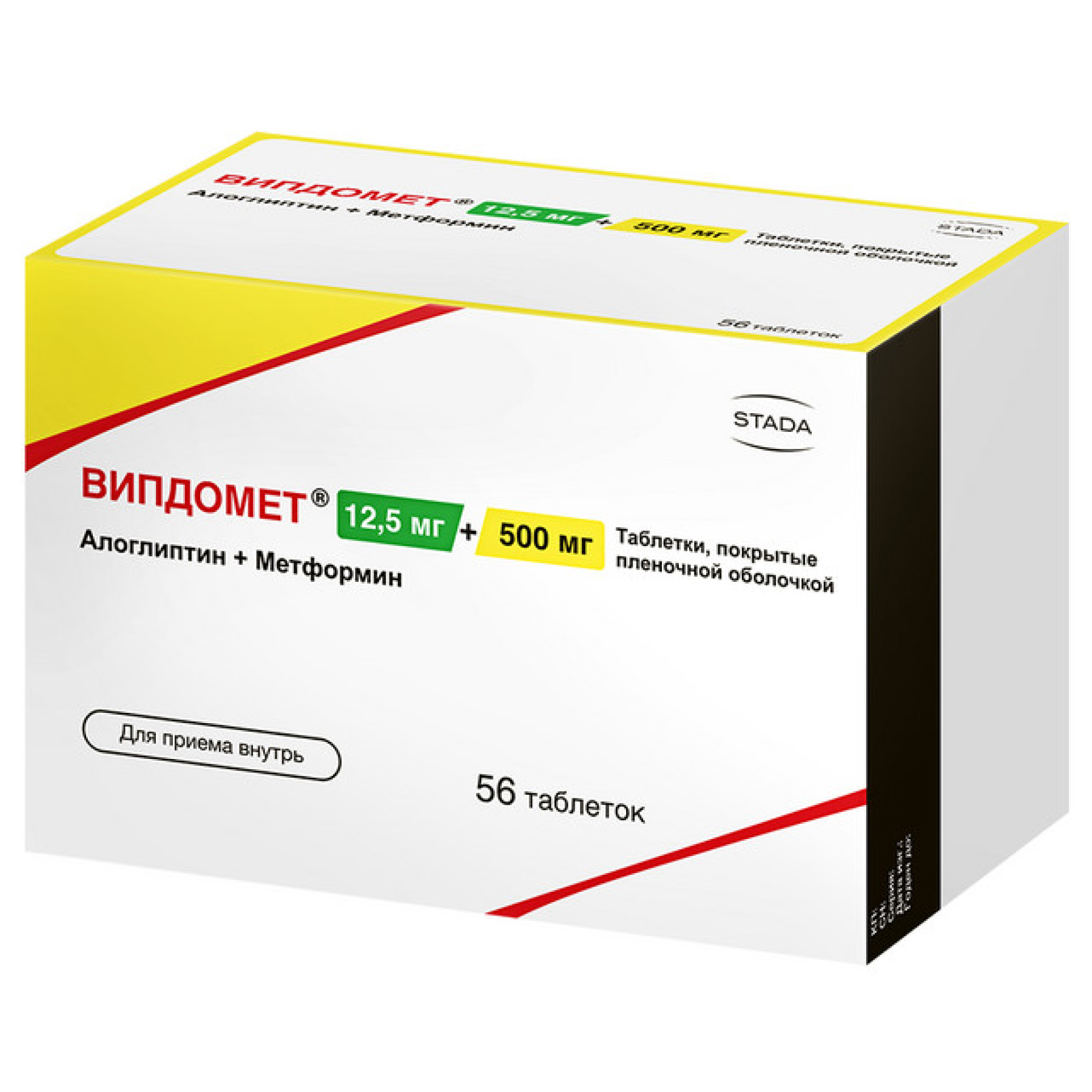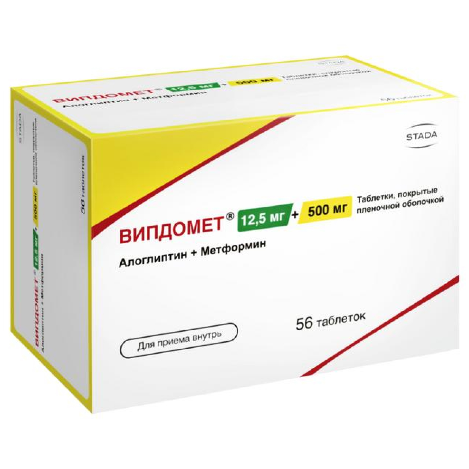 Для пациентов, не достигших адекватного контроля гликемии при монотерапии метформином: рекомендуемая доза препарата Випдомет® составляет 1 таблетка 12,5 мг + 500 мг или 12,5 мг + 1000 мг 2 раза в сутки в зависимости от уже принимаемой дозы метформина, что соответствует 25 мг алоглиптина и 1000 мг или 2000 мг метформина в сутки.