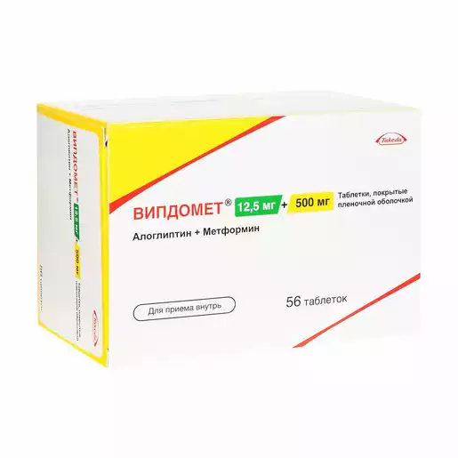 Данные по передозировке комбинированного препарата Випдомет® отсутствуют. Алоглиптин Максимальная доза алоглиптина, применяемая в клинических исследованиях, составляла 800 мг/сут у здоровых добровольцев и 400 мг/сут у пациентов с сахарным диабетом 2 типа в течение 14 дней. Это в 32 и 16 раз соответственно превышает рекомендуемую суточную дозу алоглиптина (25 мг). Какие-либо серьезные нежелательные явления при приеме препарата в этих дозах отсутствовали. Лечение: при передозировке может быть рекомендовано промывание желудка и симптоматическое лечение. Алоглиптин слабо диализируется. В клинических исследованиях только 7% дозы удалялось из организма в течение трехчасового сеанса гемодиализа. Данных об эффективности перитонеального диализа алоглиптина нет. Метформин Симптомы: значительная передозировка или сопряженные факторы риска могут привести к развитию лактоацидоза. Лечение: в случае появления признаков лактацидоза лечение препаратом необходимо немедленно прекратить, пациента срочно госпитализировать и, определив концентрацию лактата, уточнить диагноз. Наиболее эффективным мероприятием по выведению из организма лактата и метформина является гемодиализ. В случае передозировки препарата Випдомет® в дополнение к перечисленным выше методам терапии проводят симптоматическое лечение.