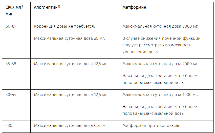 *Коррекция дозы алоглиптина осуществляется на основании данных фармакокинетического исследования, в котором функция почек оценивалась, исходя из клиренса креатинина (CrCl), рассчитанного по формуле Кокрофта-Голта.