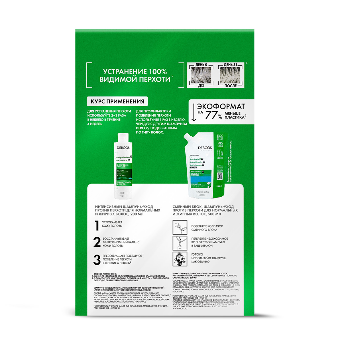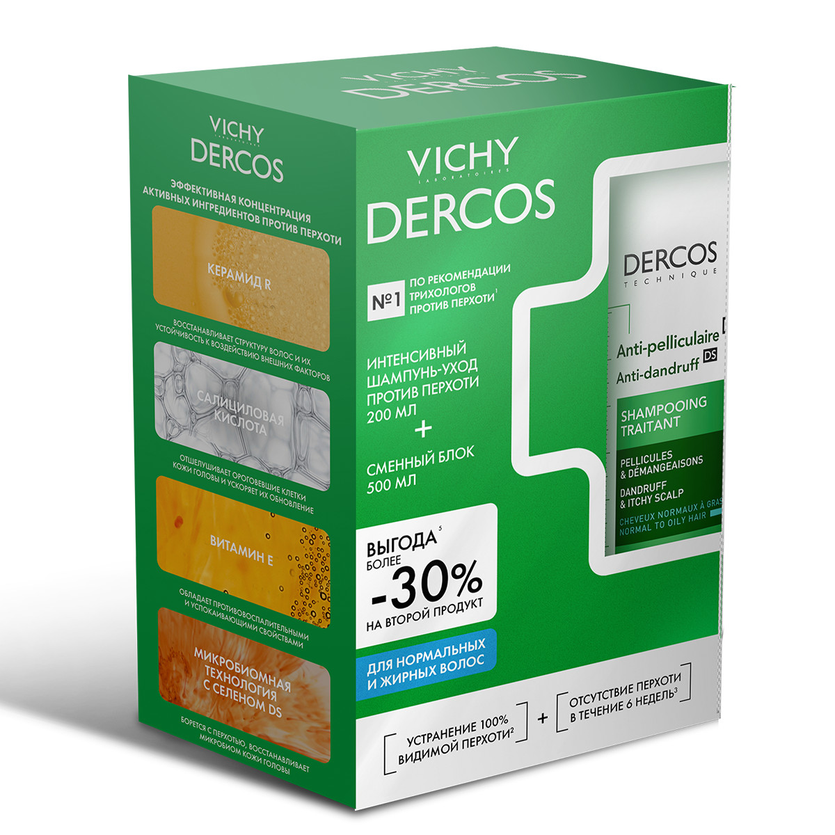 1. VICHY DERCOS Интенсивный шампунь-уход против перхоти для нормальных и жирных волос.