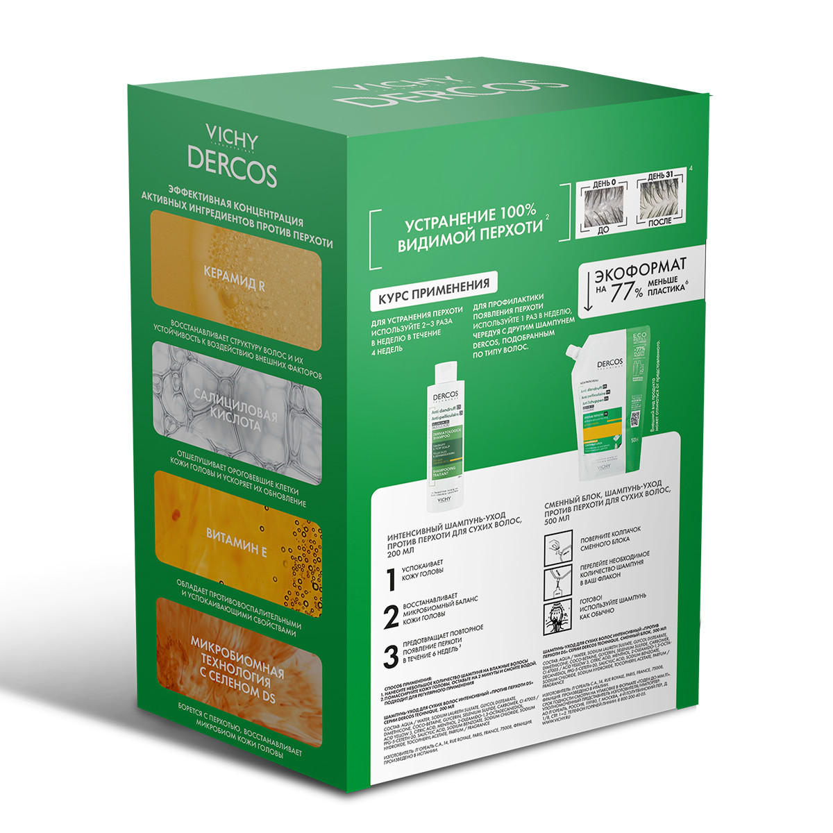 - При попадании в глаза немедленно промойте их водойШампунь-уход VICHY DERCOS против перхоти для сухих волос – самый эффективный ингредиент против перхоти. Восстанавливает микробиомный баланс кожи головы и барьерные функции, устраняет зуд и предотвращает повторное появление перхоти.