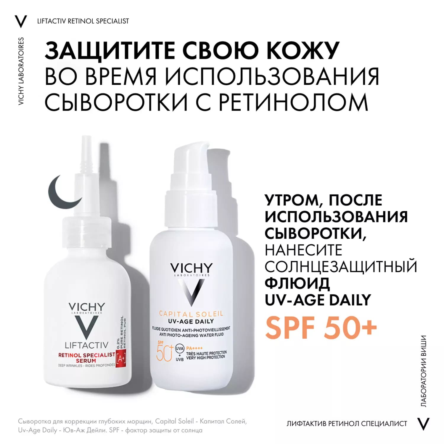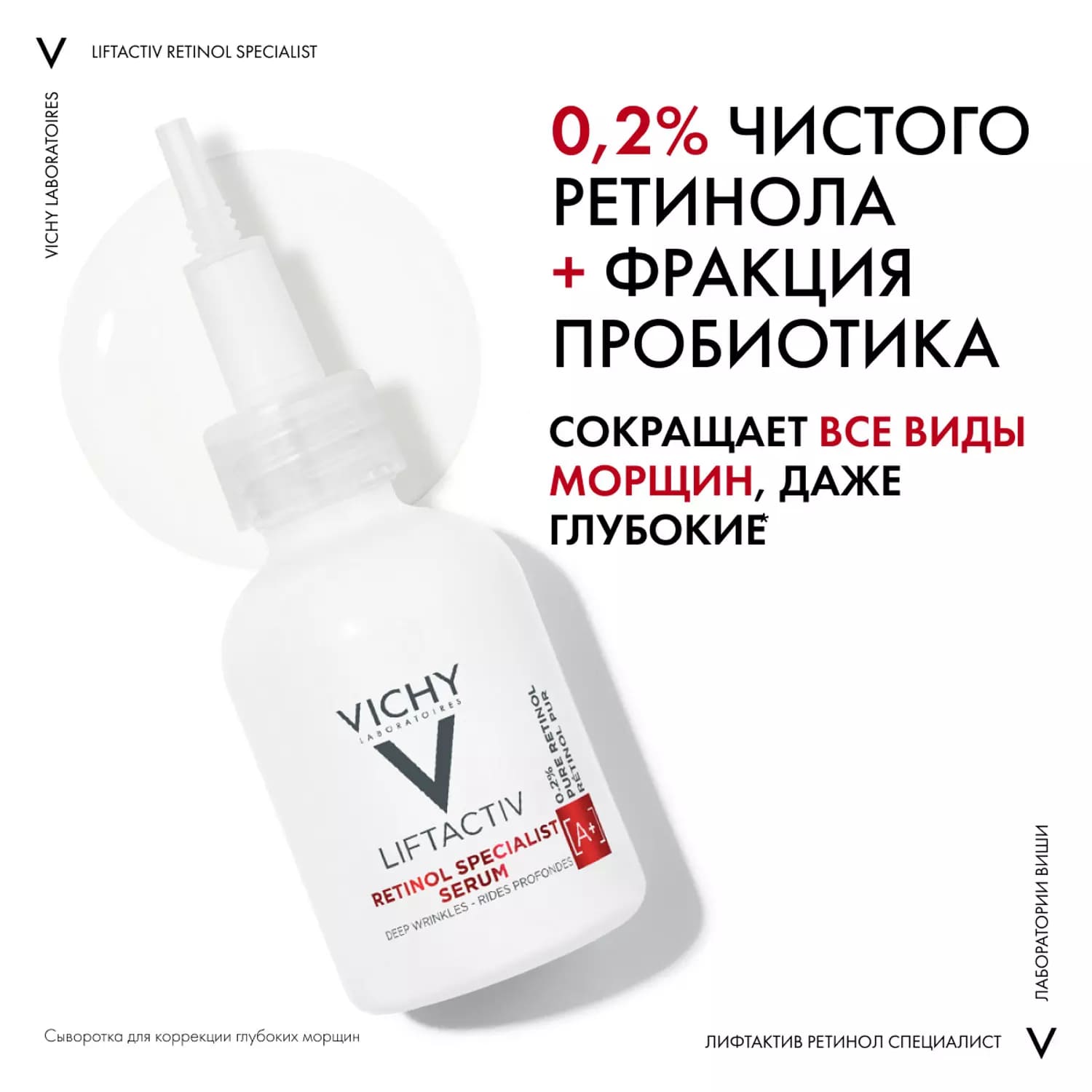 Vichy Liftactiv Retinol Specialist – мощное средство с 0,2% ретинола для коррекции всех типов морщин. Виши Лифтактив Сыворотка Ретинол Специалист направлен на сокращение морщин на лбу, межбровные морщины, морщины в уголках глаз и губ, носогубные складки, птоз нижней части лица.