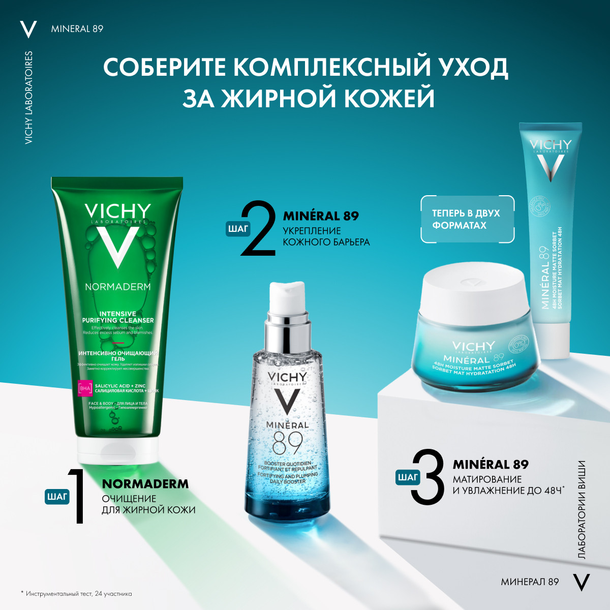 Инновация* VICHY: впервые* Лаборатории VICHY объединили в одной формуле необходимые для кожи компоненты в освежающем матирующем геле, который обеспечивает видимый контроль жирности в течение дня. Кожа мгновенно становится матовой, видимость пор заметно сокращается. Гель-сорбет помимо матирования кожи обеспечивает длительное увлажнение на 48 часов**. Разработан специально для жирной и комбинированной кожи лица.