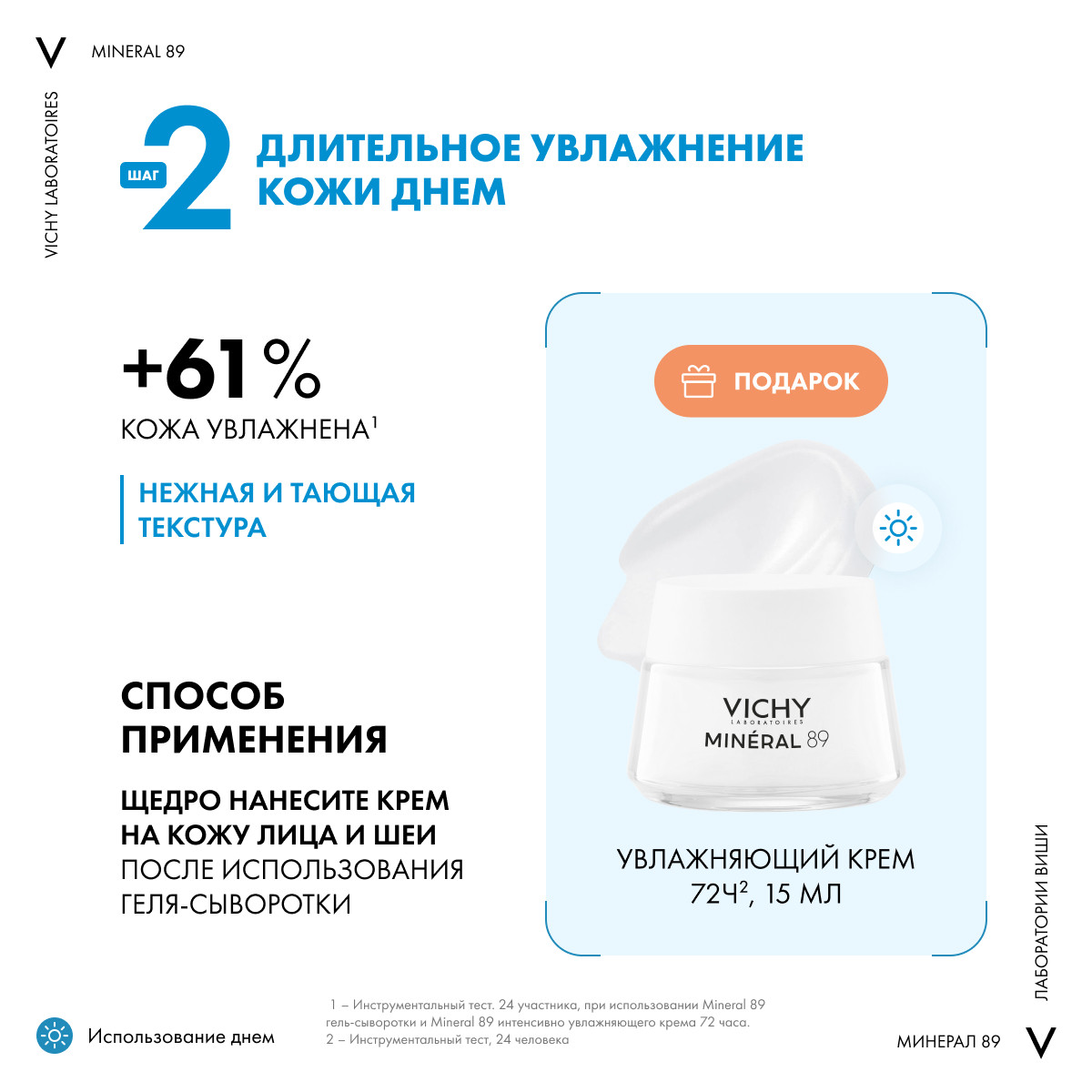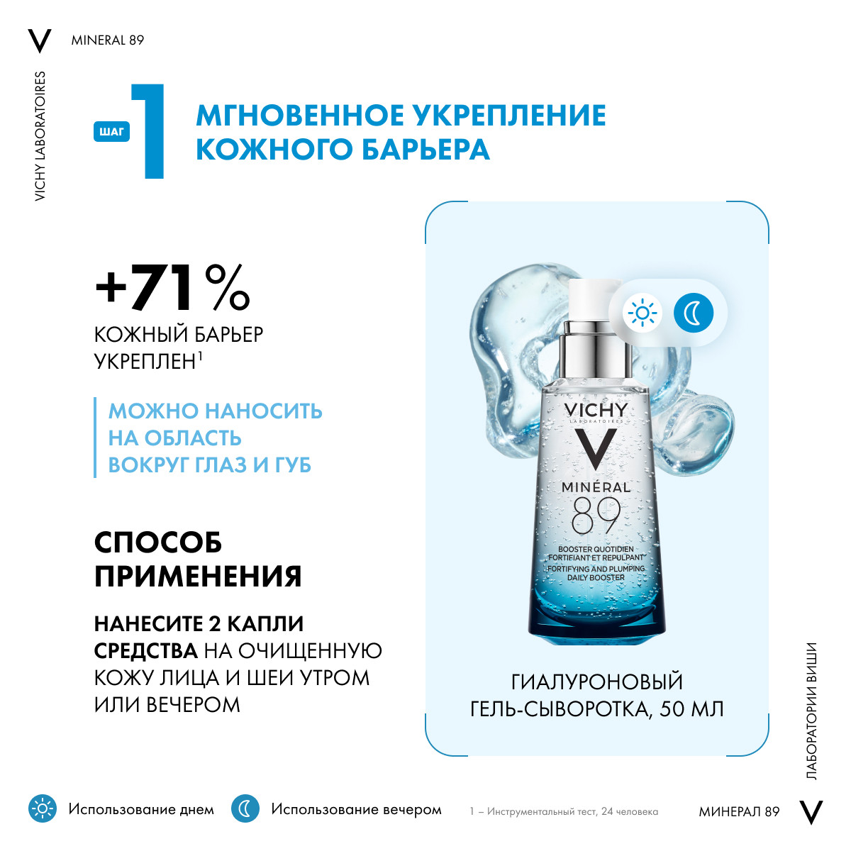 Гель-сыворотка: минерализирующая термальная вода Vichy 89%, гиалуроновая кислота в высокой концентрации.
