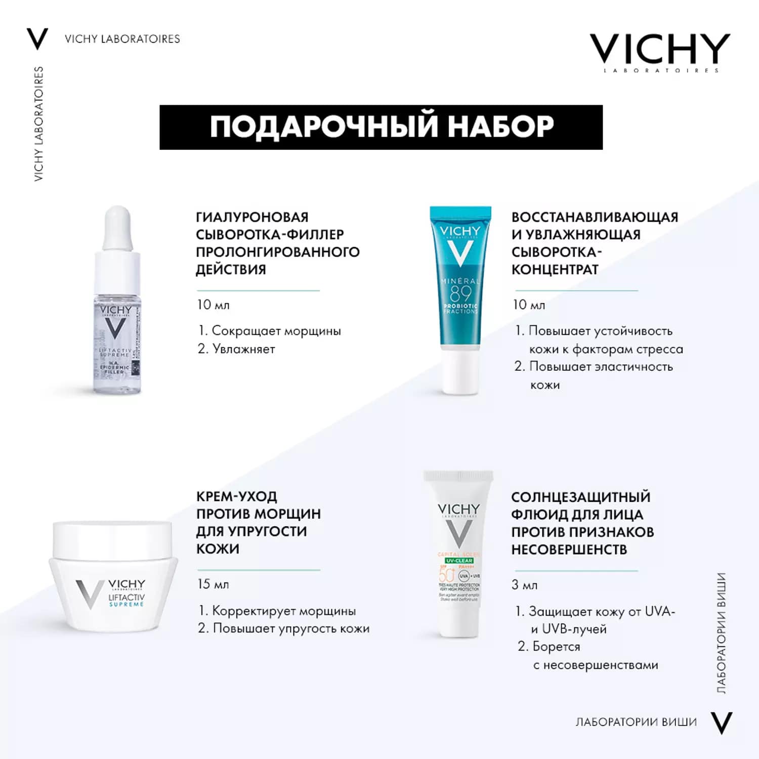 Антиоксидантный уход, Защита SPF 50+, Коррекция морщин, Матирование, Очищение кожи, Повышение упругости и эластичности, Сияние кожи, Снятие макияжа, Увлажнение кожи, Успокаивающий уход.