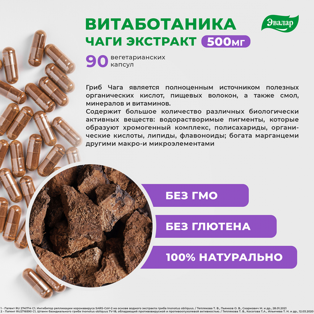 Чаги экстракт, компоненты капсулы (пищевые добавки); гидроксипропилметилцеллюлоза (загуститель); диоксид кремния аморфный и стеарат магния (агенты антислеживающие), целлюлоза микрокристаллическая (носитель).