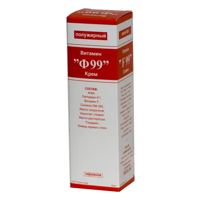 Благодаря высокому содержанию витамина F, крем отлично снимает воспалительные процессы, повышает барьерные свойства кожи. Биоактивный комплекс натуральных компонентов крема "Витамин Ф99" тонизирует кожу, повышает влагоудерживающие свойства эпидермиса, оказывает капилляроукрепляющее действие.
