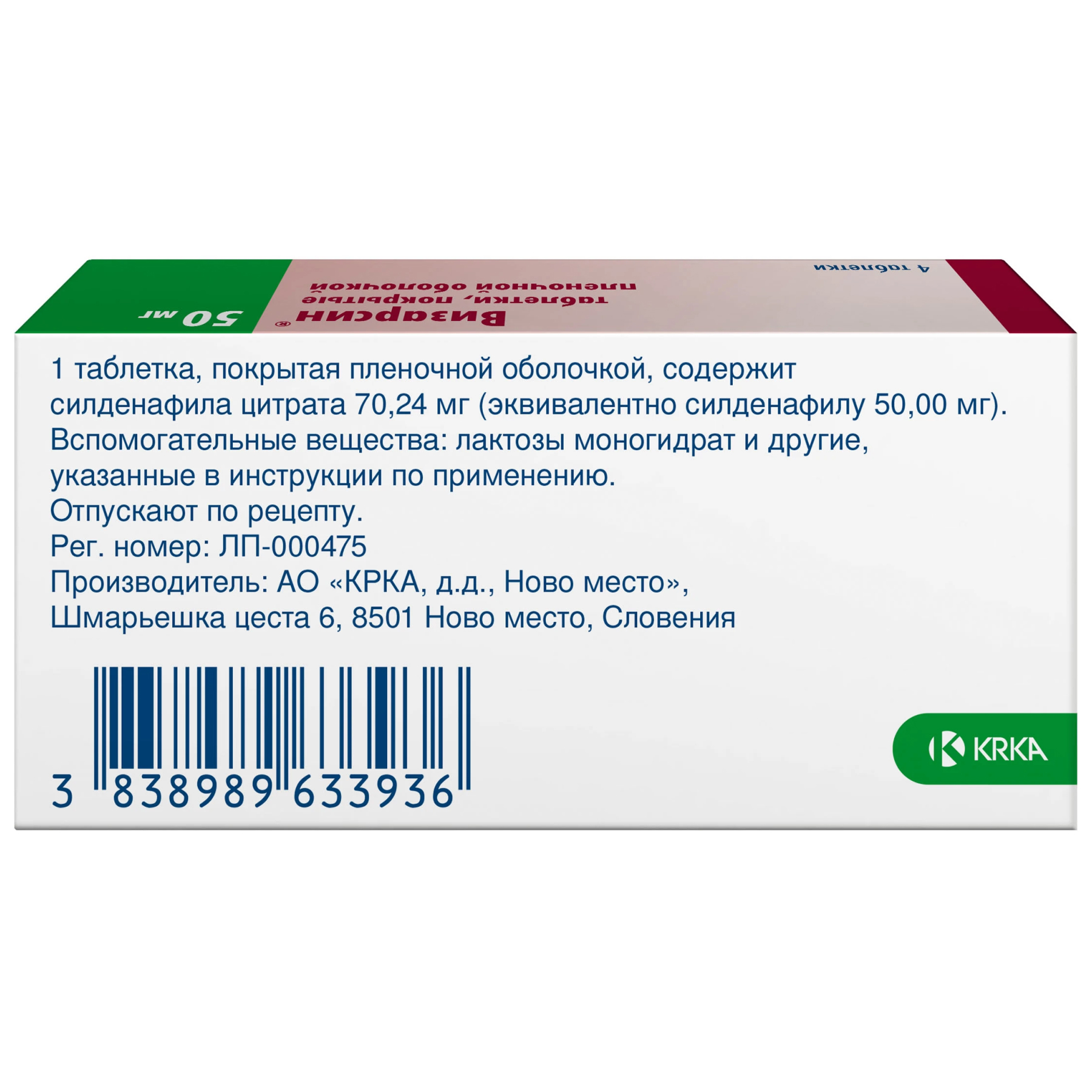 Действующее вещество: Силденафила цитрат 70.24 мг, что соответствует содержанию силденафила 50 мг