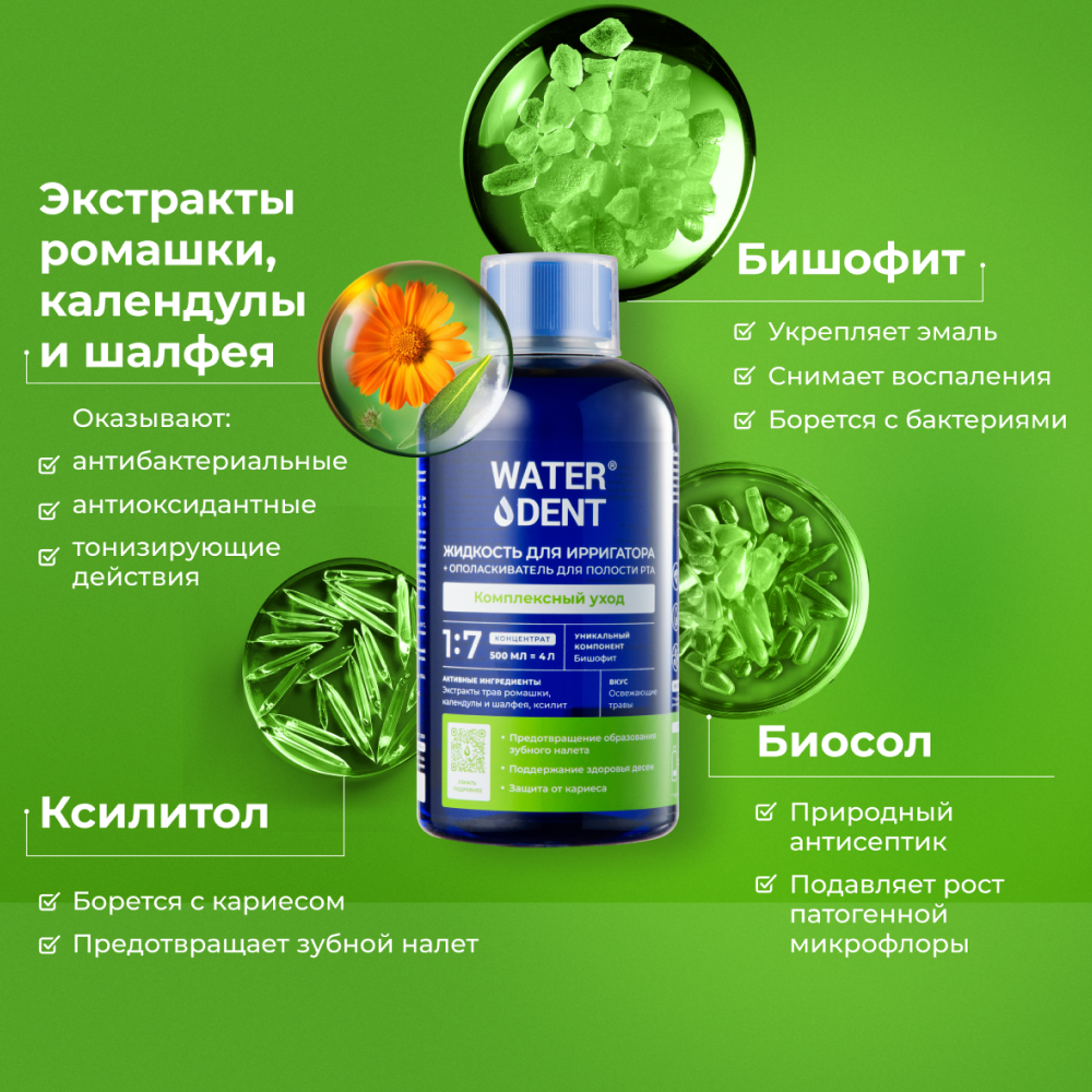 Жидкость для ирригатора + ополаскиватель для полости рта 2в1 «WATERDENT» Комплексный уход разработана специально для поддержания здоровья десен и защиты от кариеса.