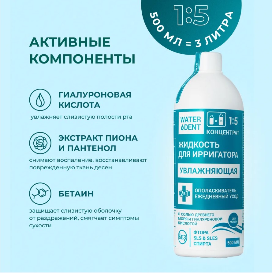 Сухость во рту? Увлажняющая жидкость для ирригатора с гиалуроновой кислотой устранит сухость во рту и придаст свежесть дыханию! Экстракт пиона и пантенол снимут воспаление, обеспечат длительное увлажнение и восстановят поврежденную ткань десен. Используй также как обычный ополаскиватель.