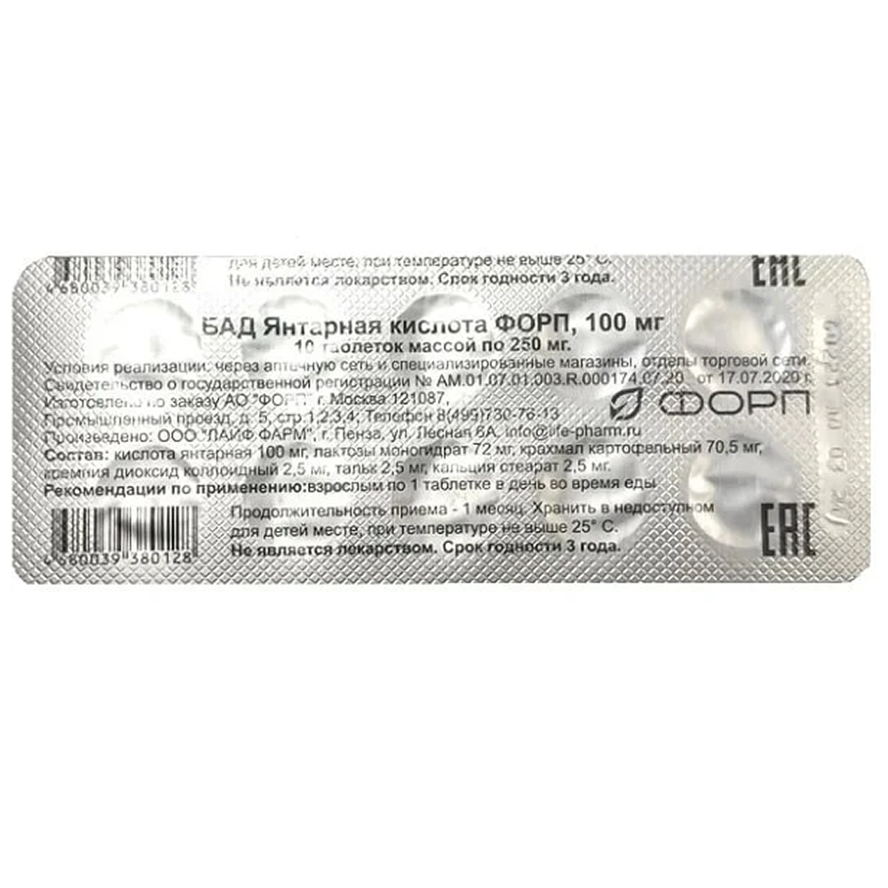 Активное вещество: Кислота янтарная - 100 мг;