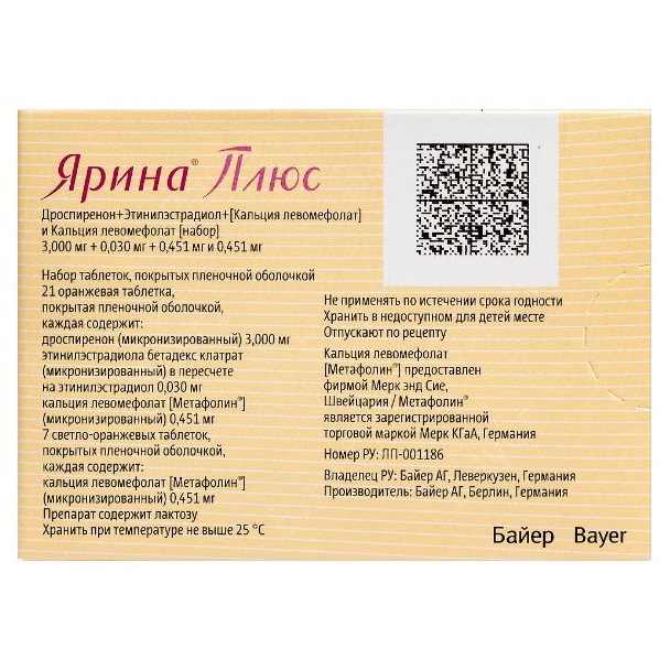 В состав таблетки Ярина плюс входит левомефолат. Он является формой фолиевой кислоты, способствует восстановлению менструального цикла, уменьшает кровопотери, болям в животе. По сравнению с пероральным контрацептивом Яриной, Ярина Плюс может назначаться как средство для контрацепции на фоне различного рода заболеваний. Назначается специалистом по результатам проведенных анализов крови. Таблетки Ярина плюс назначаются при непродолжительном приеме, если беременность планируется через полгода или год.